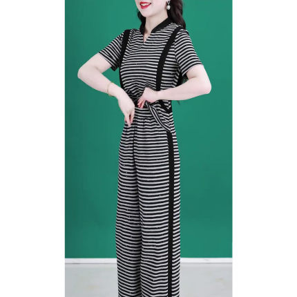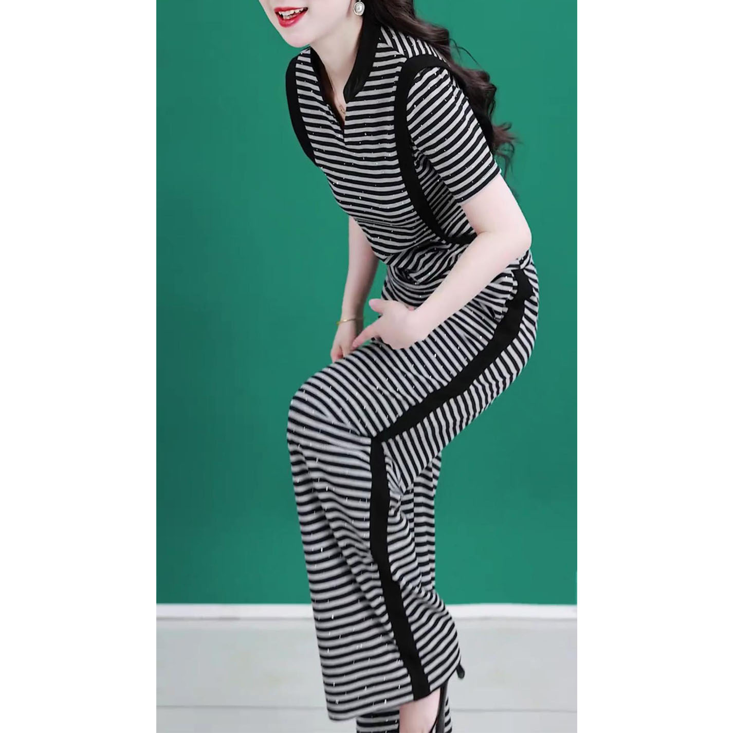 时尚短袖套装女2025夏季新款洋气设计感条纹上衣阔腿裤休闲两件套