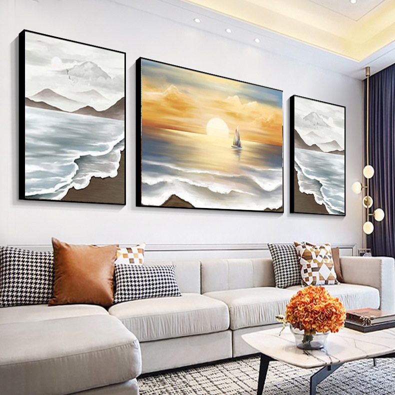 日出纯手绘油画挂画沙发背景墙风景现代轻奢客厅三联画装饰画