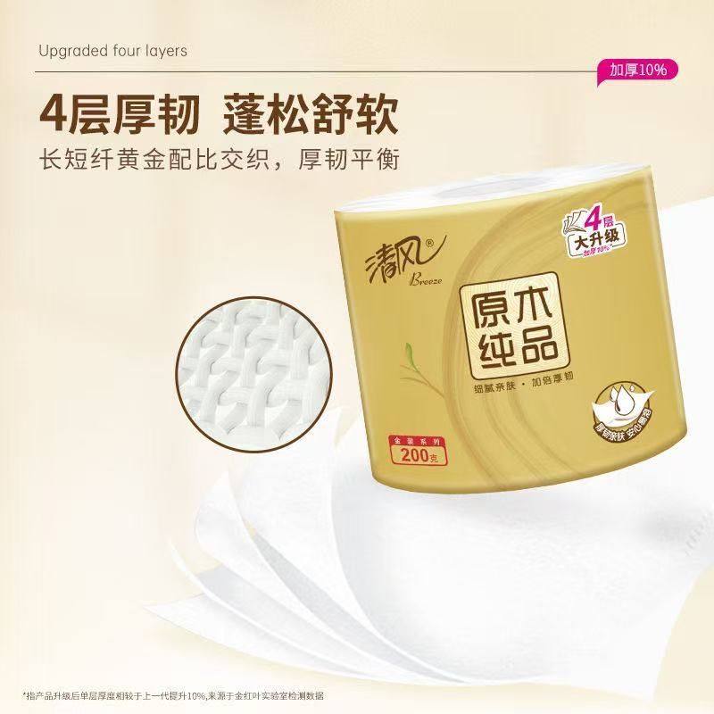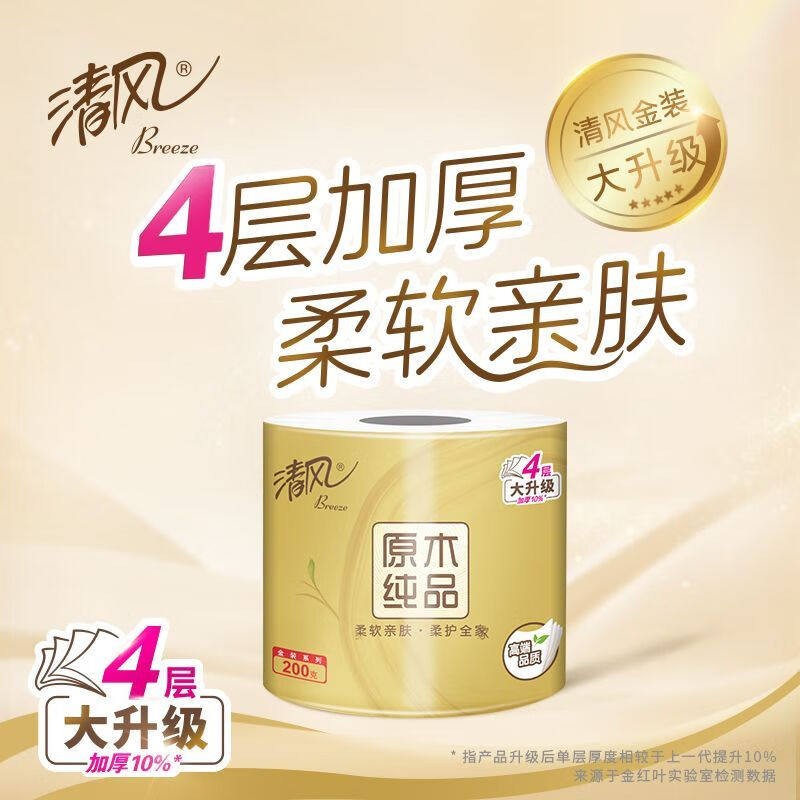 清风原木金装有芯卷纸4层200克10卷提装家用卫生纸卷筒纸家用厕纸