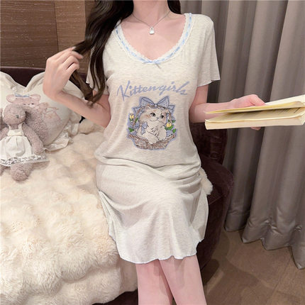 夏季软妹自带胸垫坑条棉圆领花边短袖睡裙可爱猫咪甜美莫代尔睡衣