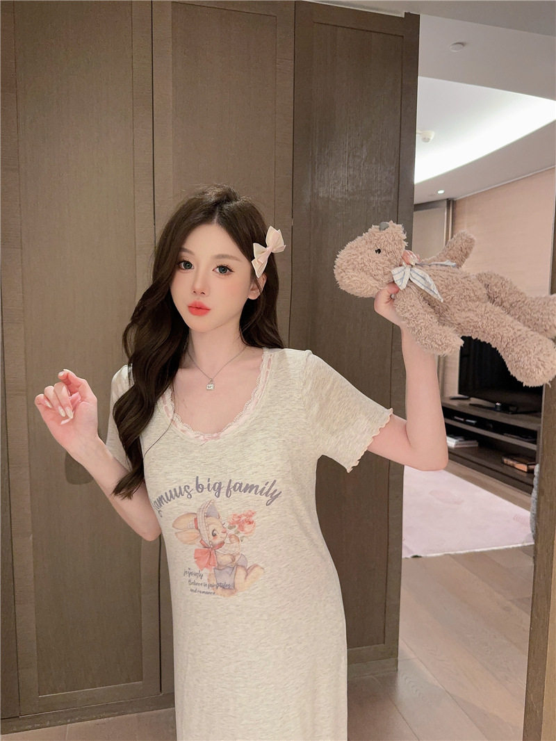 莫代尔短袖睡裙坑条棉圆领甜美夏