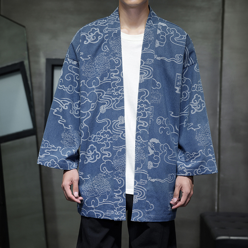 中国风风衣男中长款大衣秋季新中式复古开衫道袍龙纹提花牛仔外套