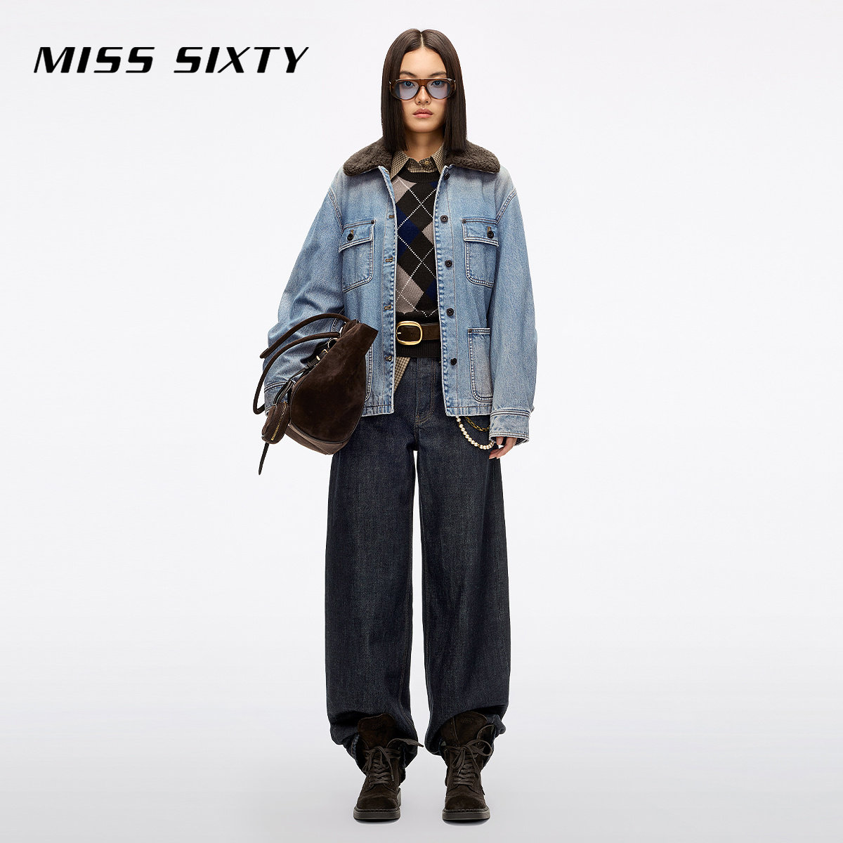 Miss Sixty2025冬季新款针织衫女圆领长袖菱格纹上衣毛衣