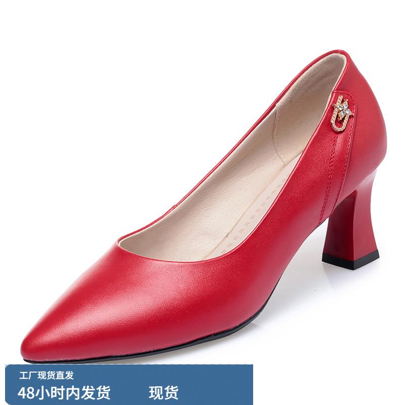 红色单鞋女中跟软皮粗跟真皮浅口防滑春夏季皮鞋高跟软底尖头女鞋