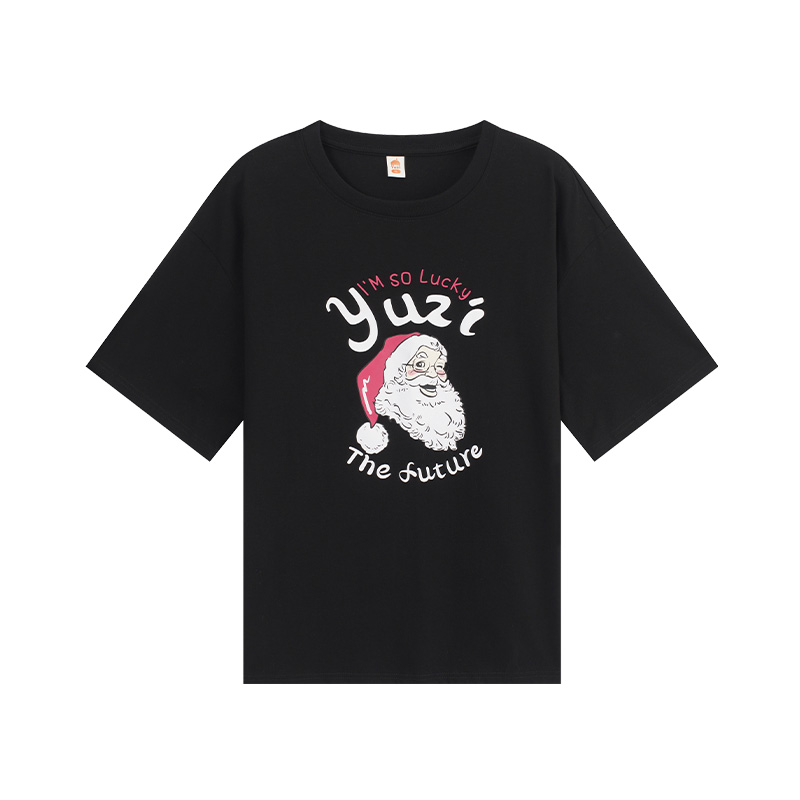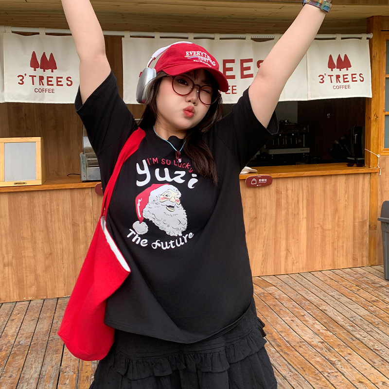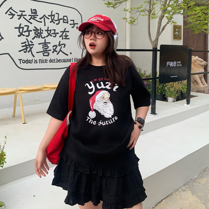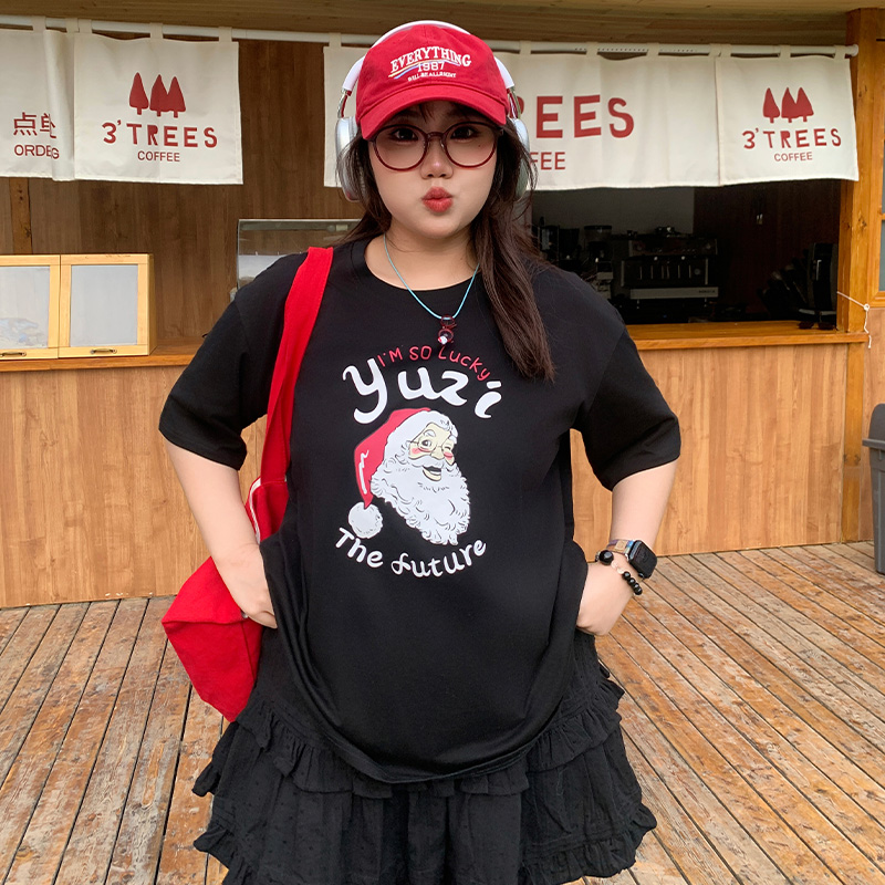 YUZI鱼子圣诞老人T恤大码女装夏微胖mm显瘦遮肉200斤印花百搭上衣