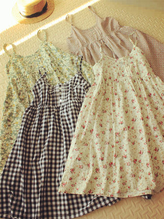 新款日系无袖连衣裙甜美印花吊带裙森系碎花裙纯棉布高腰裙