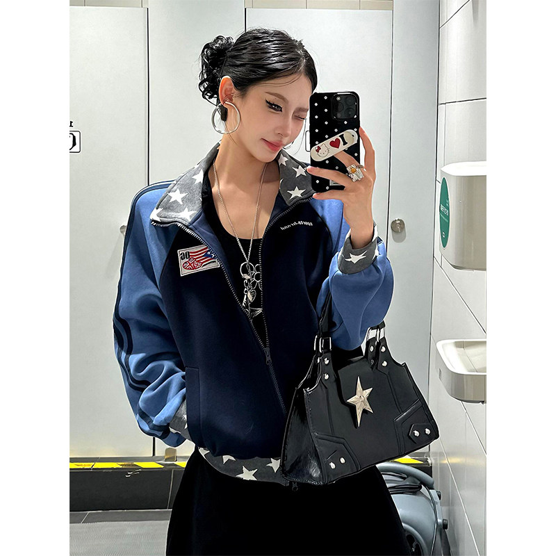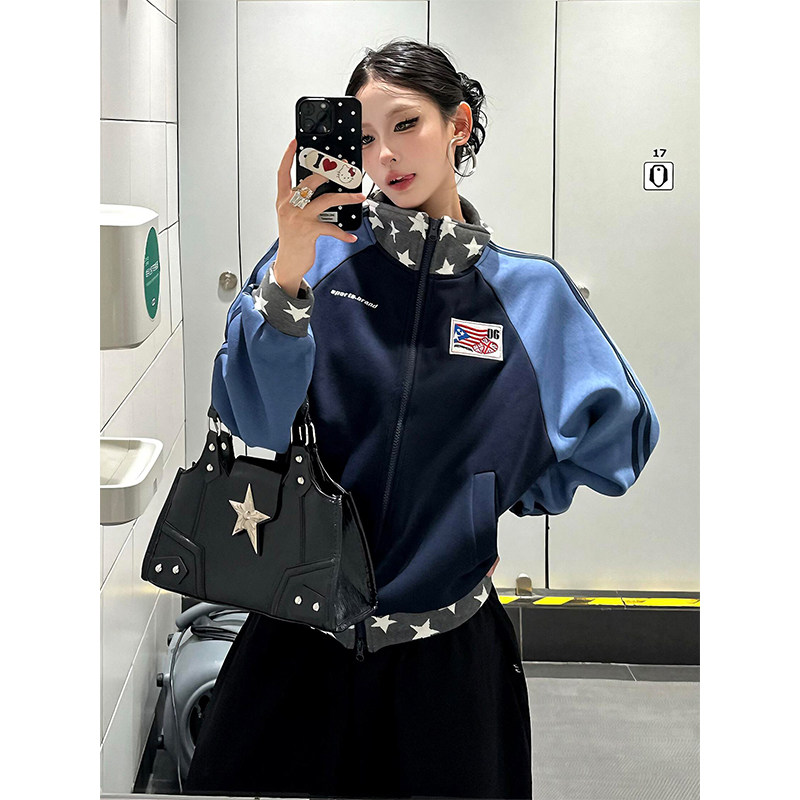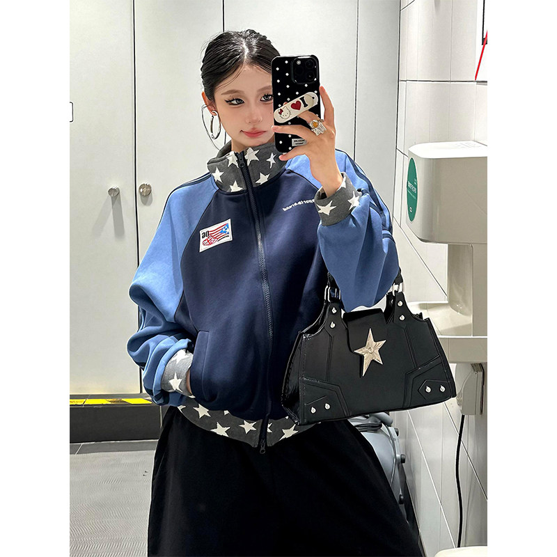 美式复古星星立领运动开衫卫衣外套男女秋季拼接宽松撞色短款上衣