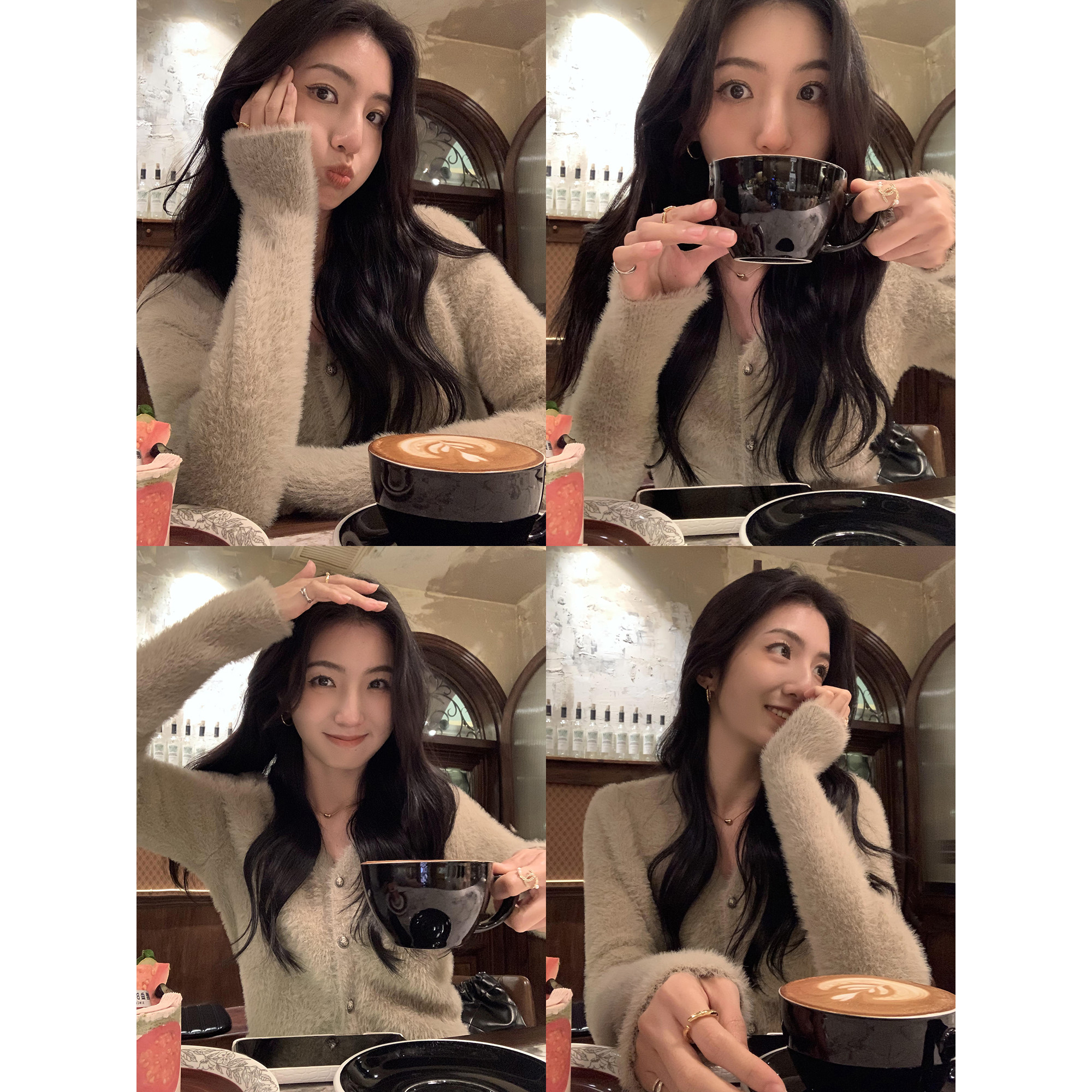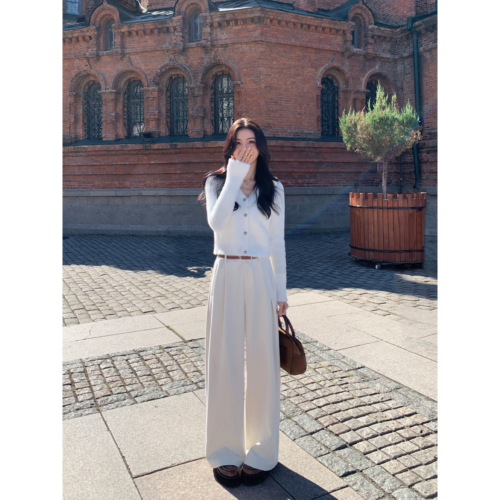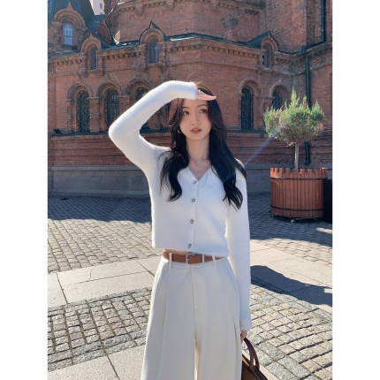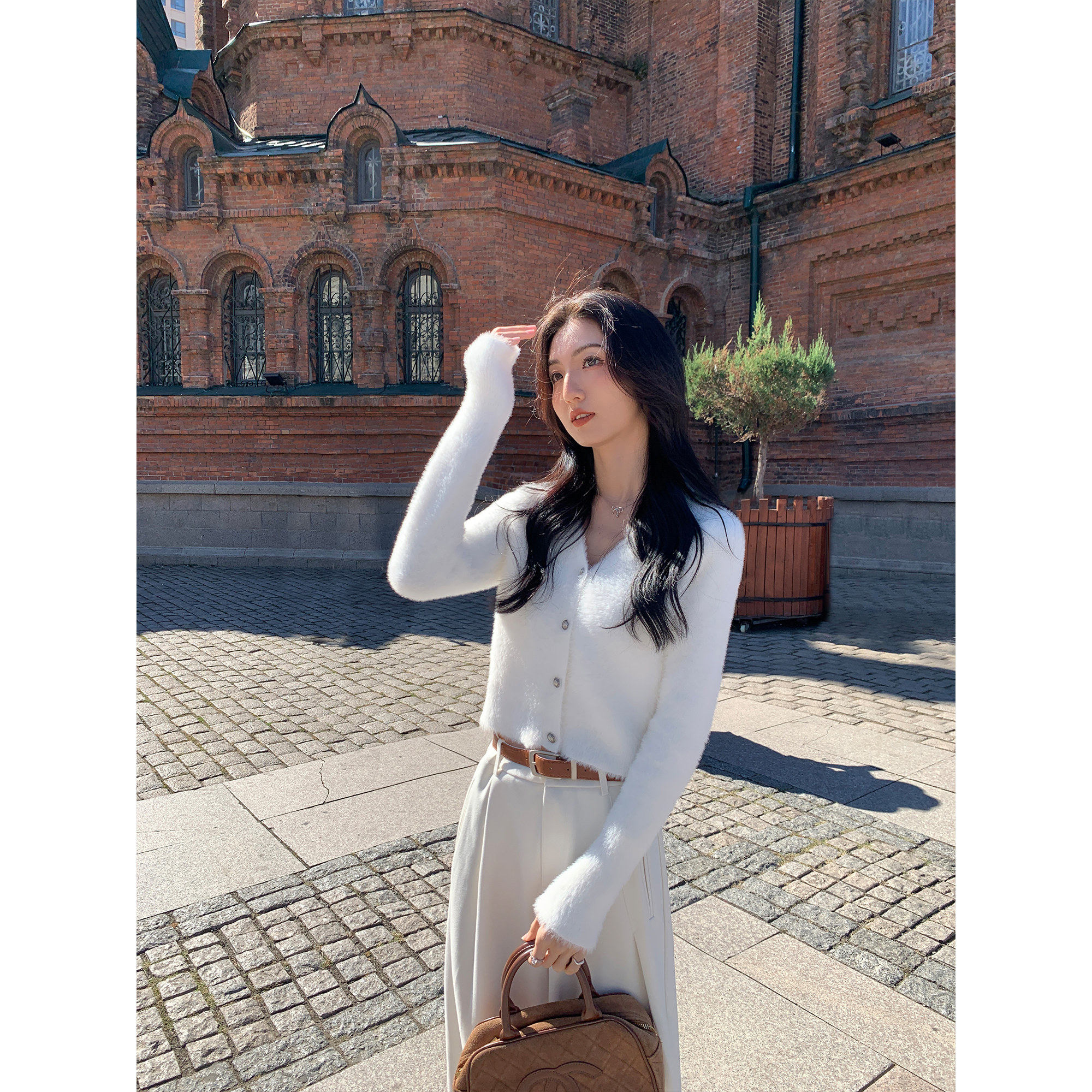 MULVAN 温柔白色V领针织开衫女秋冬软糯宽松慵懒百搭短款毛衣外套