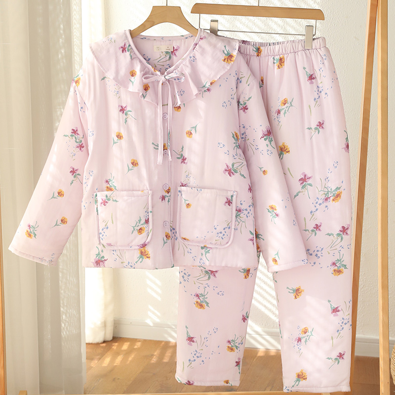 富朵冬季双层纱加厚夹棉三层棉袄睡衣外穿女士纯棉保暖家居服套装