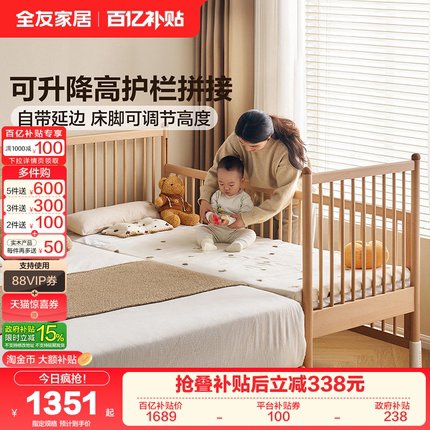 全友家居北欧原木风儿童婴儿拼接实木床边加宽卧室升降护栏床KS