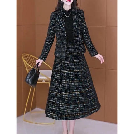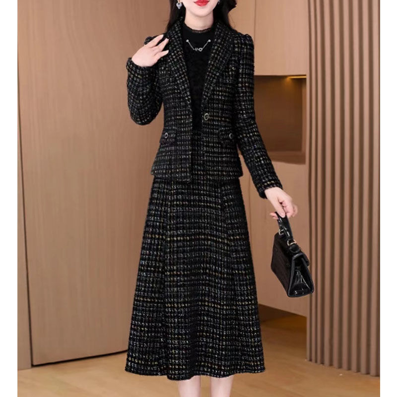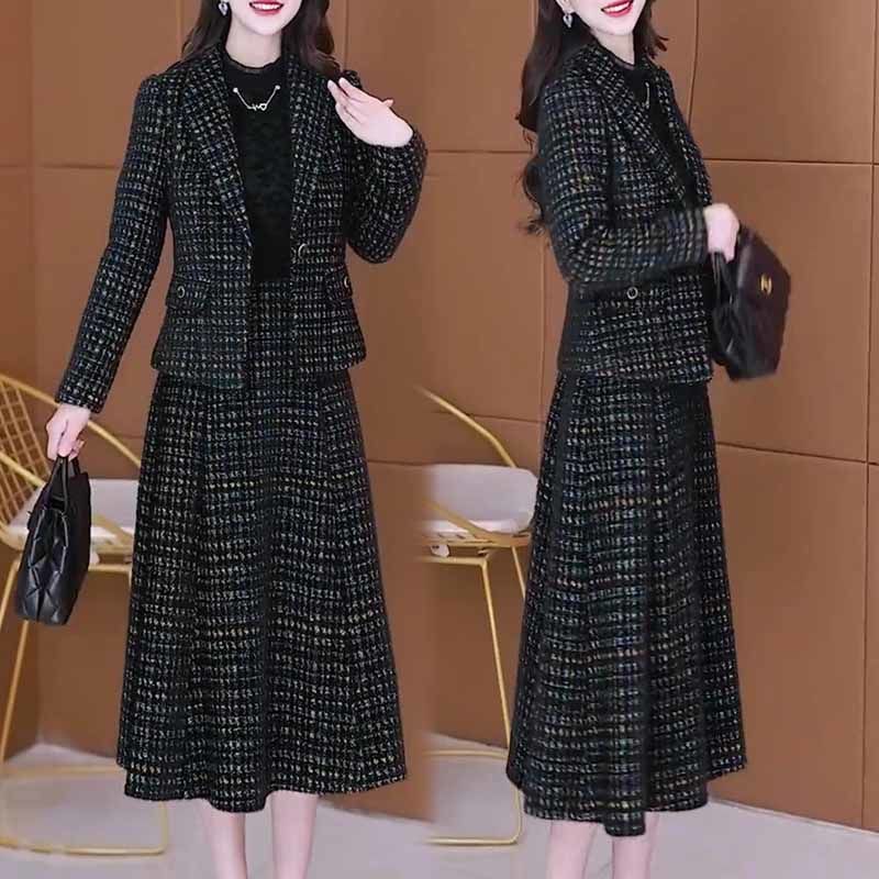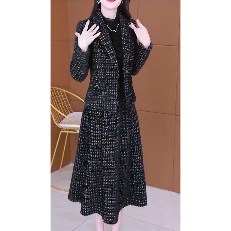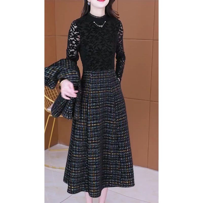 时尚西服套装女2025秋季新款洋气西装外套+蕾丝拼接连衣裙两件套