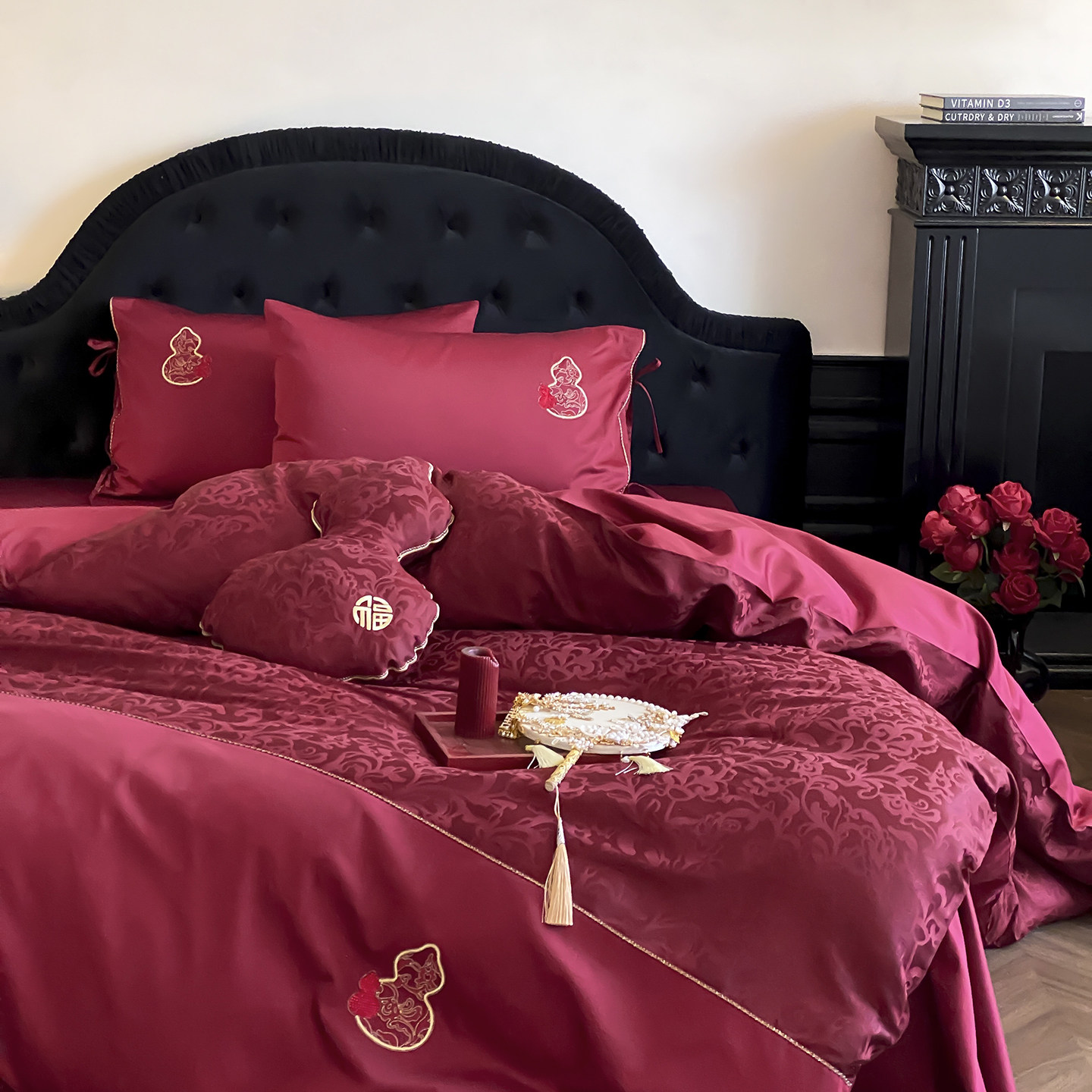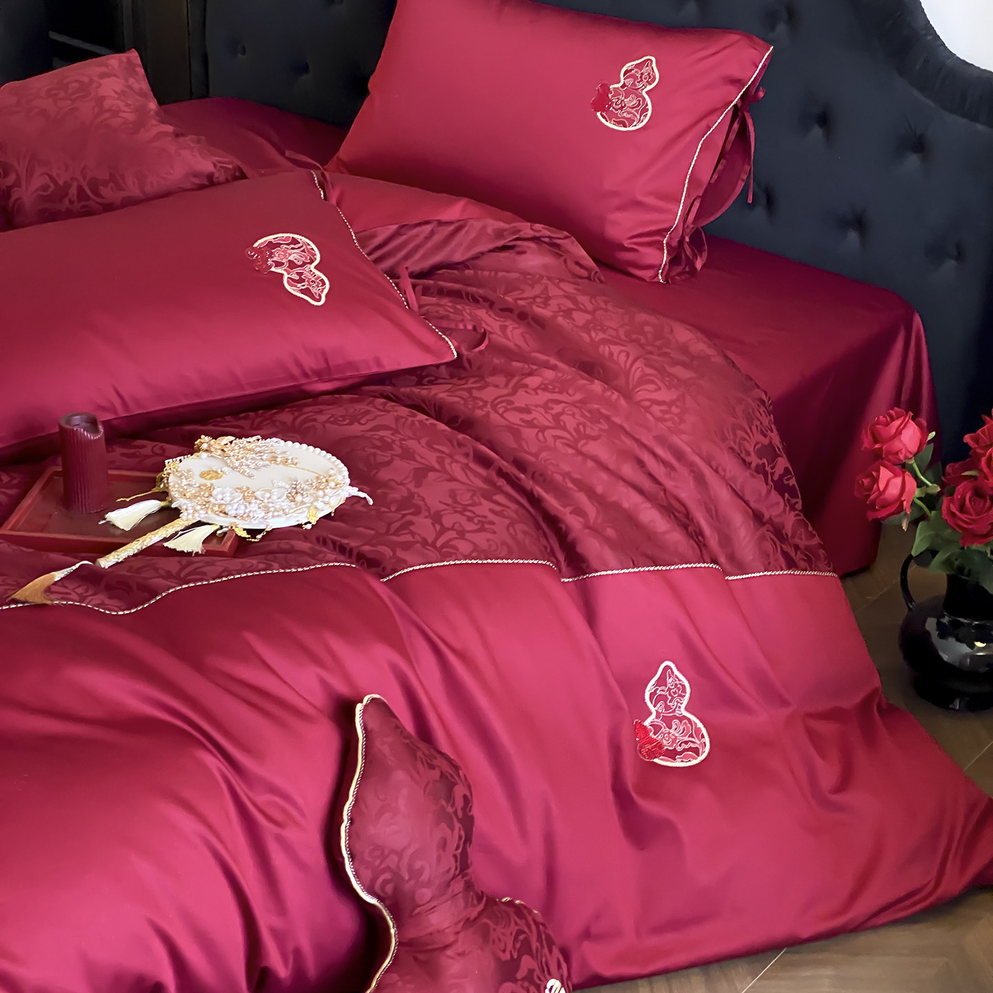 高级感浪漫提花100S全棉婚庆四件套红色刺绣被套床单结婚床上用品