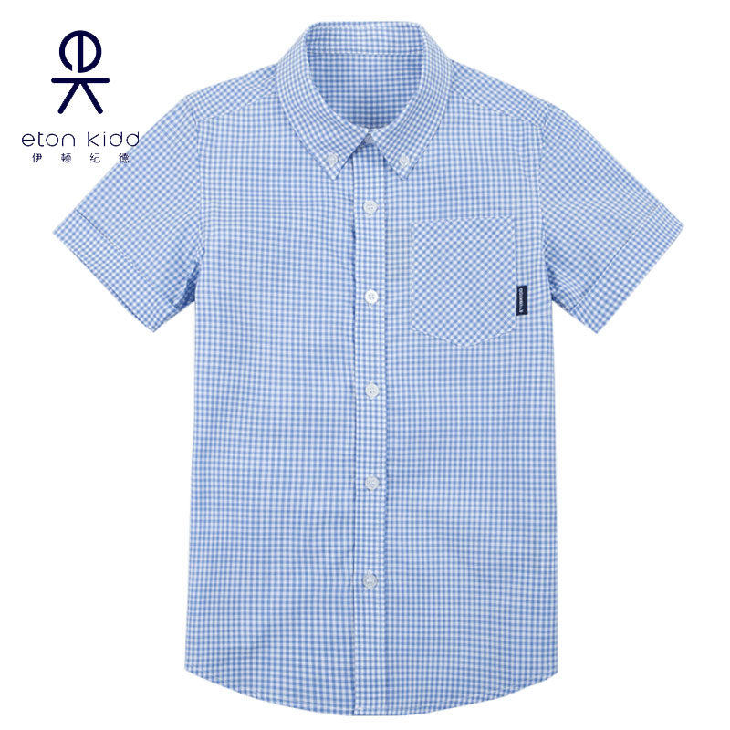 伊顿纪德男童全棉短袖衬衫夏季 中小学儿童浅蓝格子衬衣16C102