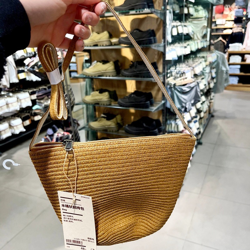 日系无印纸编贝壳包斜挎包女编织单肩包古铜拉链轻便随身包包