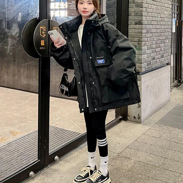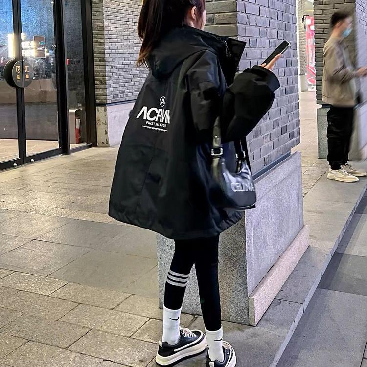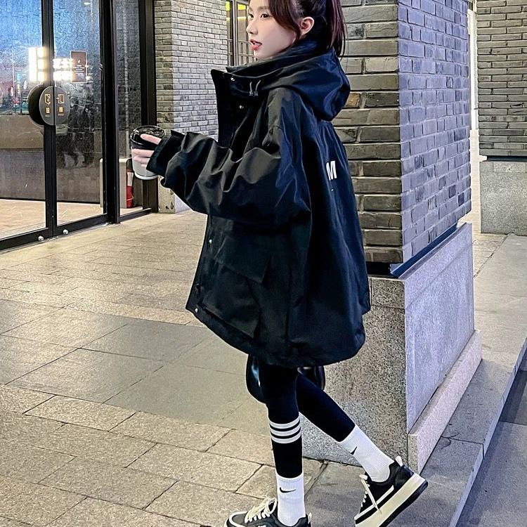 时尚休闲连帽风衣女2025春秋季新款宽松显瘦中长款加棉派克服外套