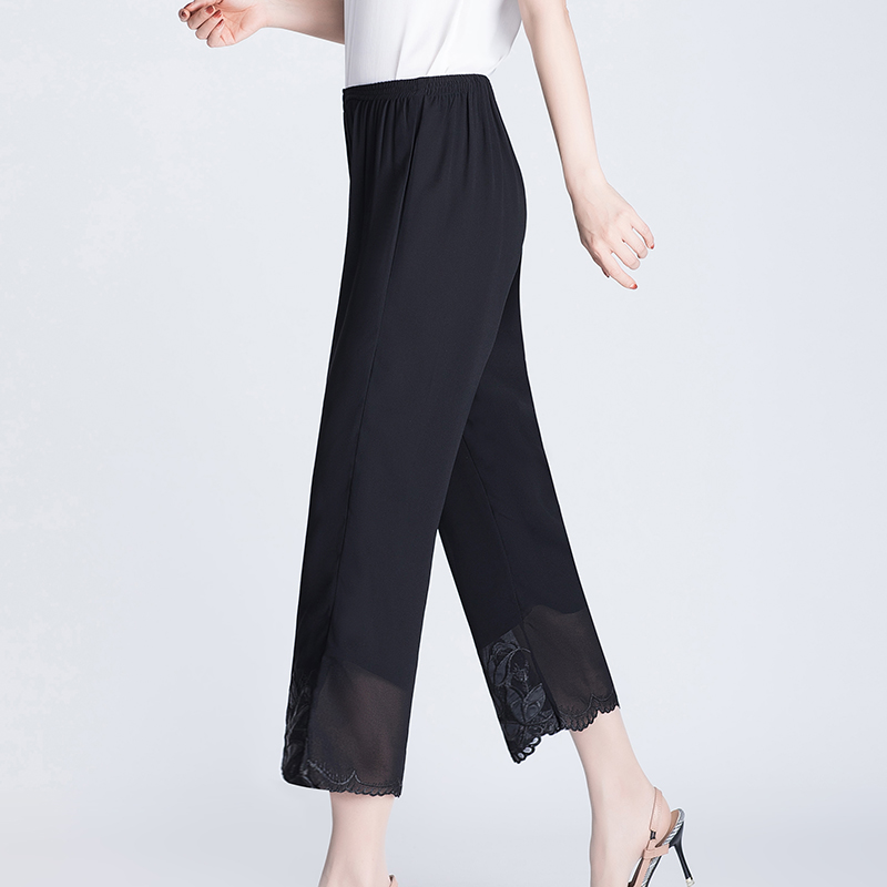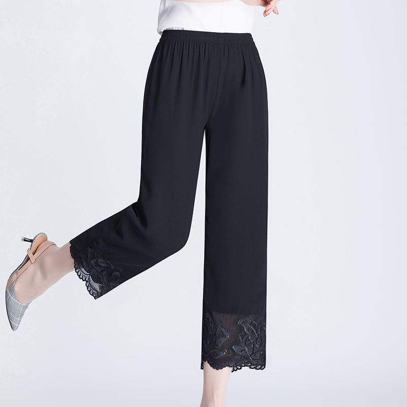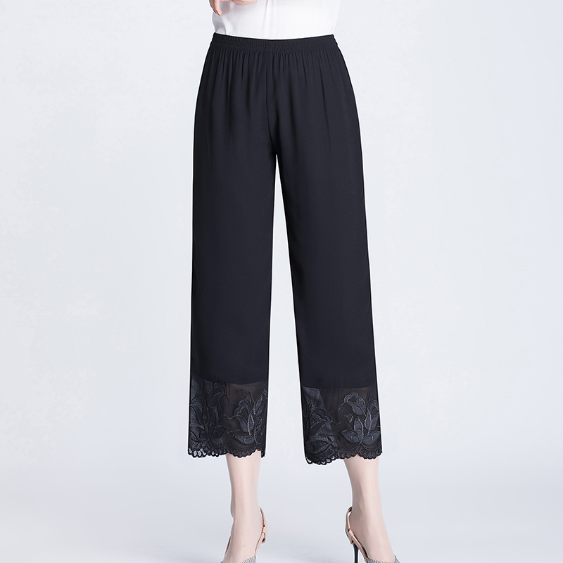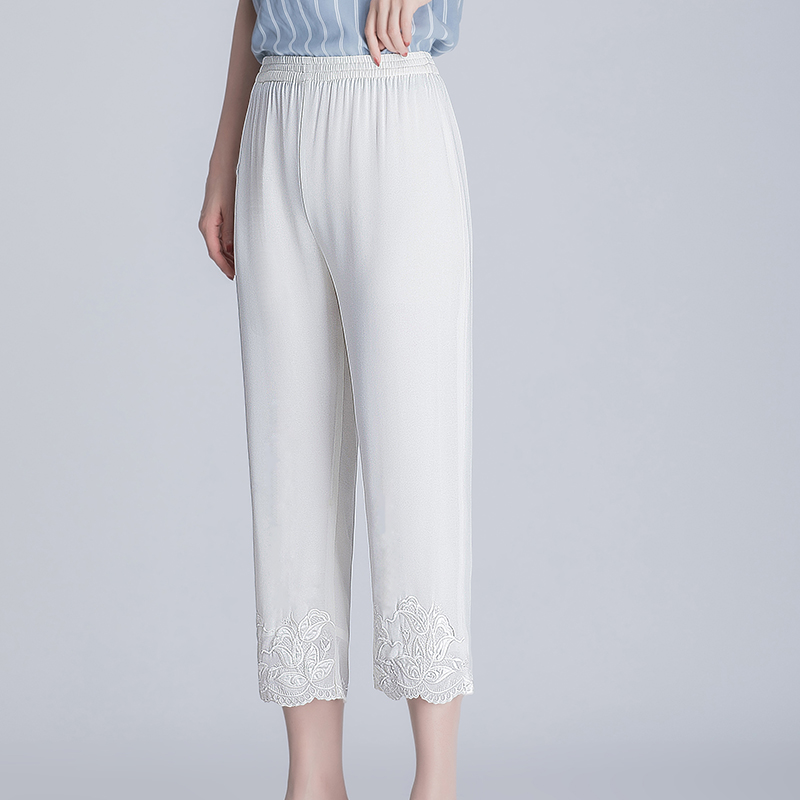 妈妈直筒裤子夏中老年婆婆休闲宽松绣花奶奶真丝裤中年九分女裤薄