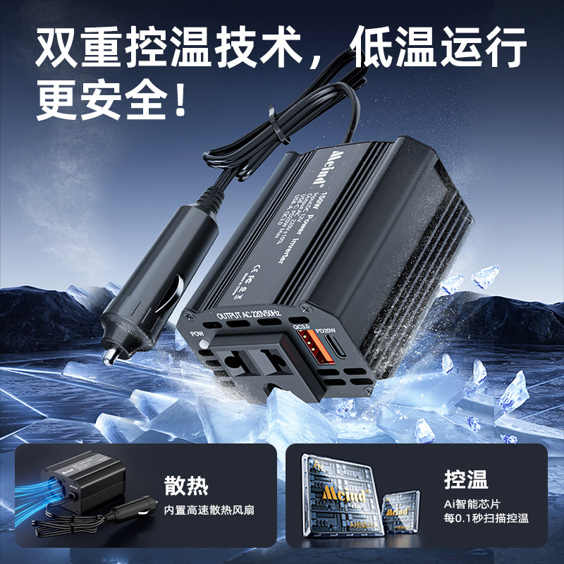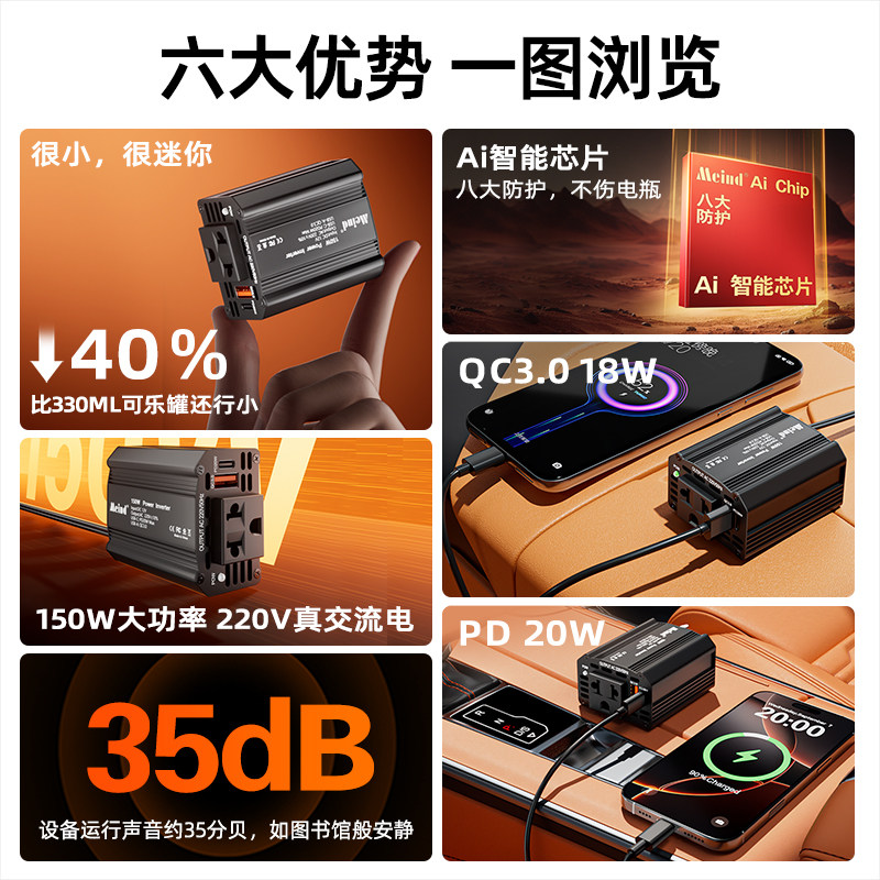 美诺迪车载逆变器12V转220V充电器超级快充汽车点烟器转换器150W