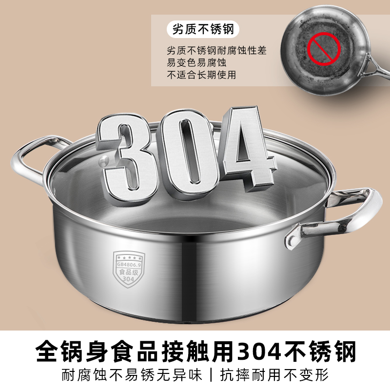 加厚食品级304不锈钢汤锅家用电磁炉专用平底清汤锅双耳复底火锅