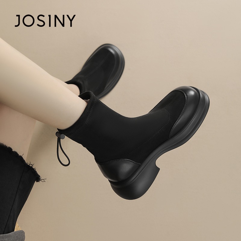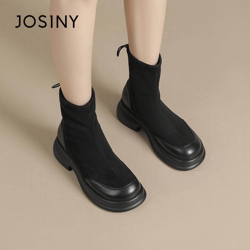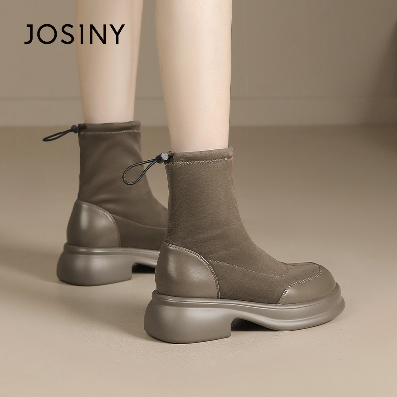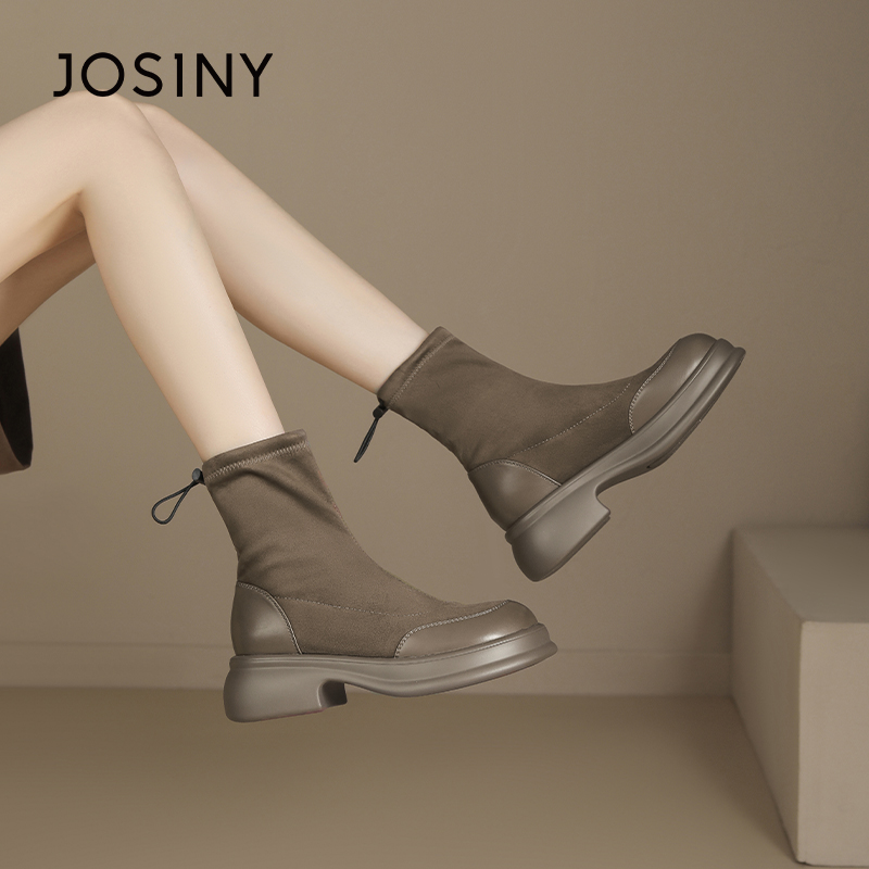 卓诗尼女靴冬季撤柜正品复古弹力袜靴皮绒拼接圆头抽绳调节百搭潮