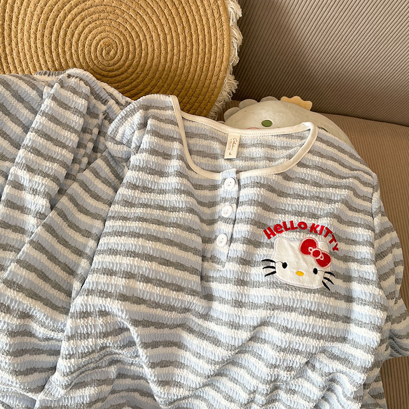 带胸垫灰蓝KT猫睡衣女春秋夏季泡泡棉长袖长裤套装可爱薄款家居服