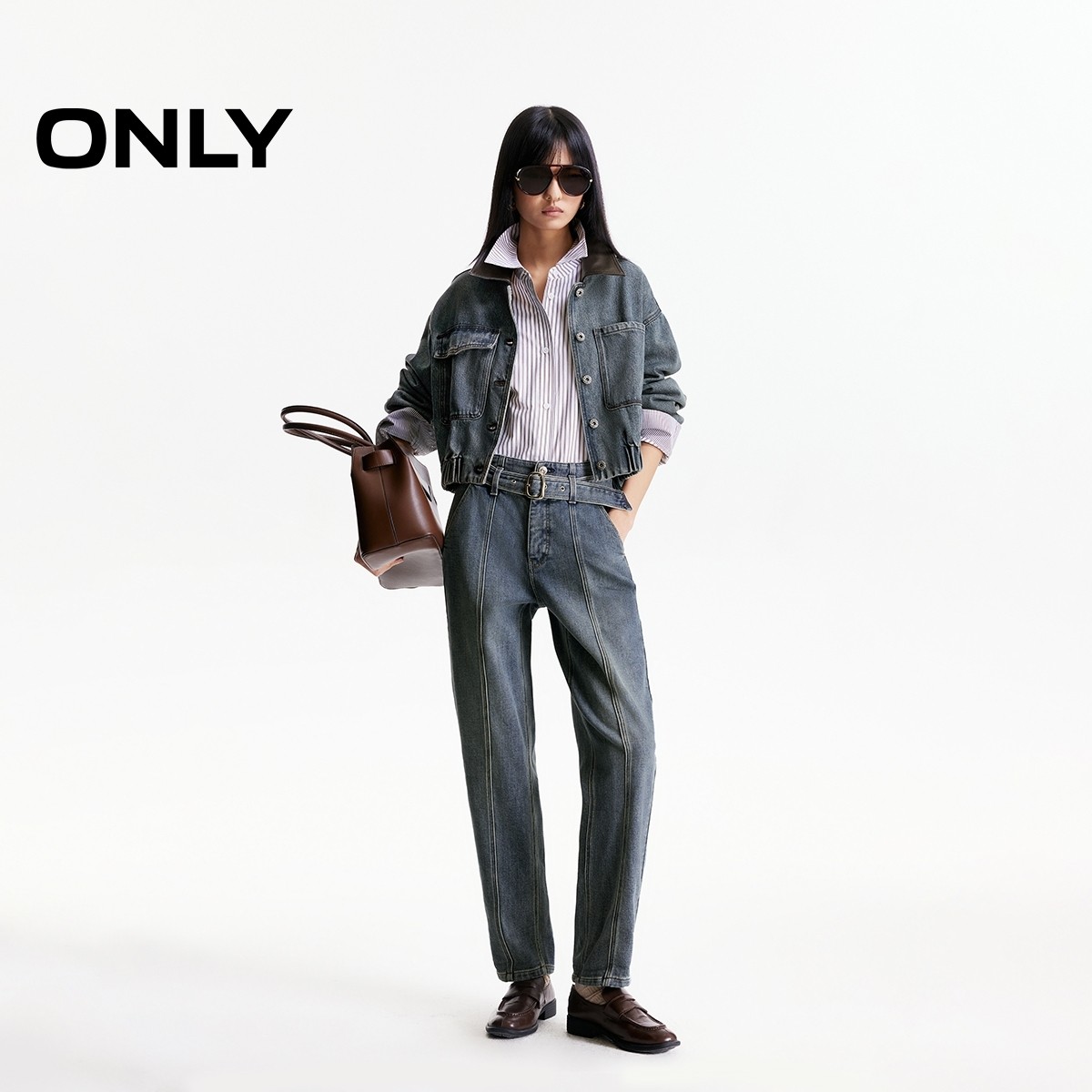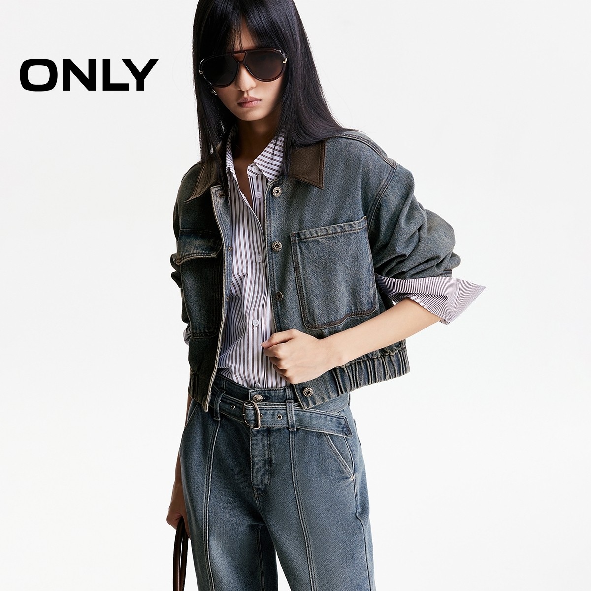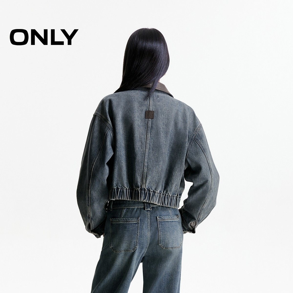 绫致ONLY2025秋冬新款酷飒拼接PU翻领落肩宽松牛仔外套女