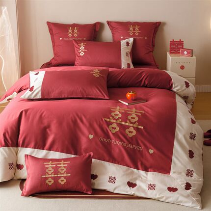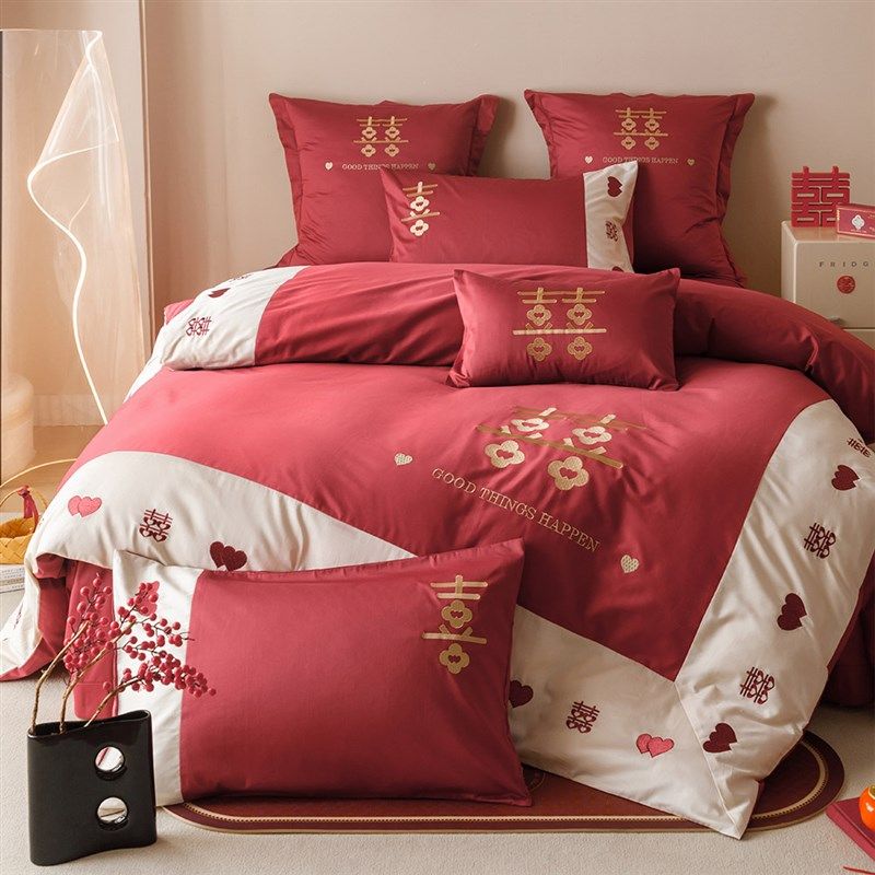 新中式婚庆四件套全棉100支长绒棉红色喜字刺绣结婚被套床单床品