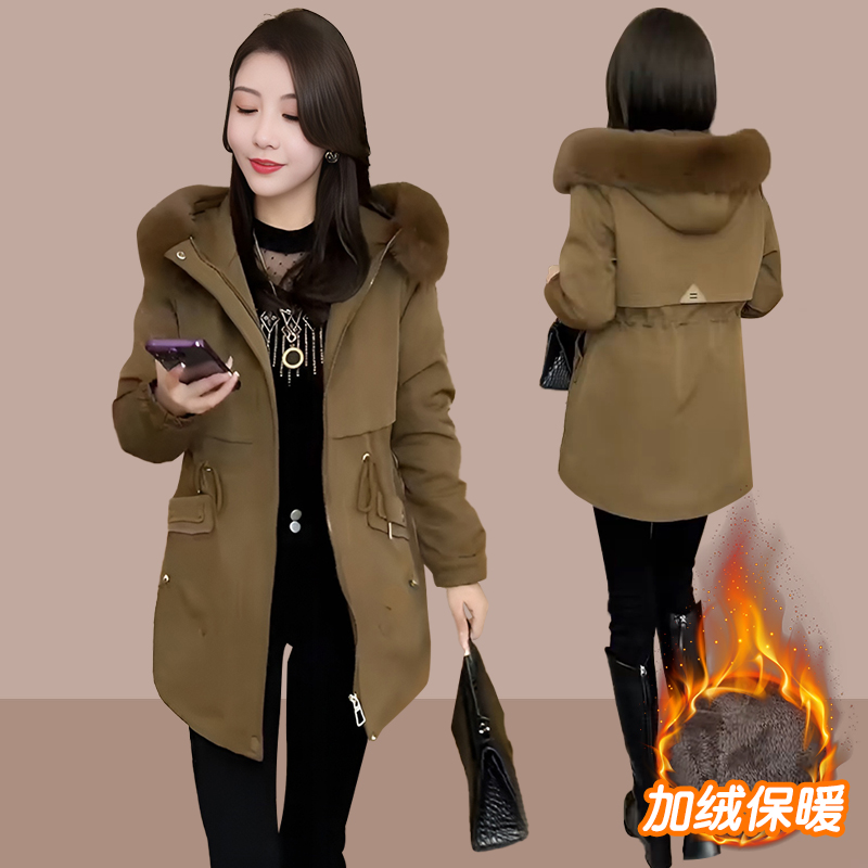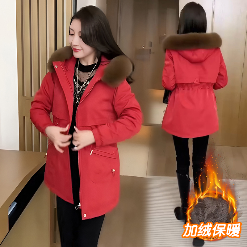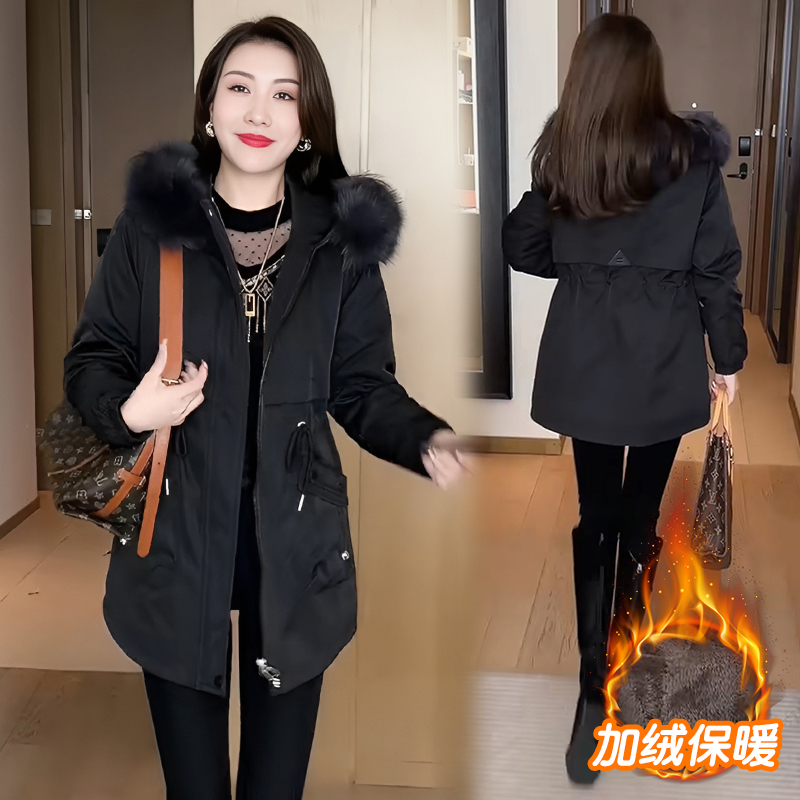 加绒加厚连帽派克服女秋冬季妈妈装保暖大毛领中长款棉衣棉服外套