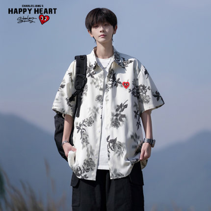 查尔斯桃心短袖衬衫男复古水墨画夏季夏威夷沙滩纽扣翻领衬衣外套