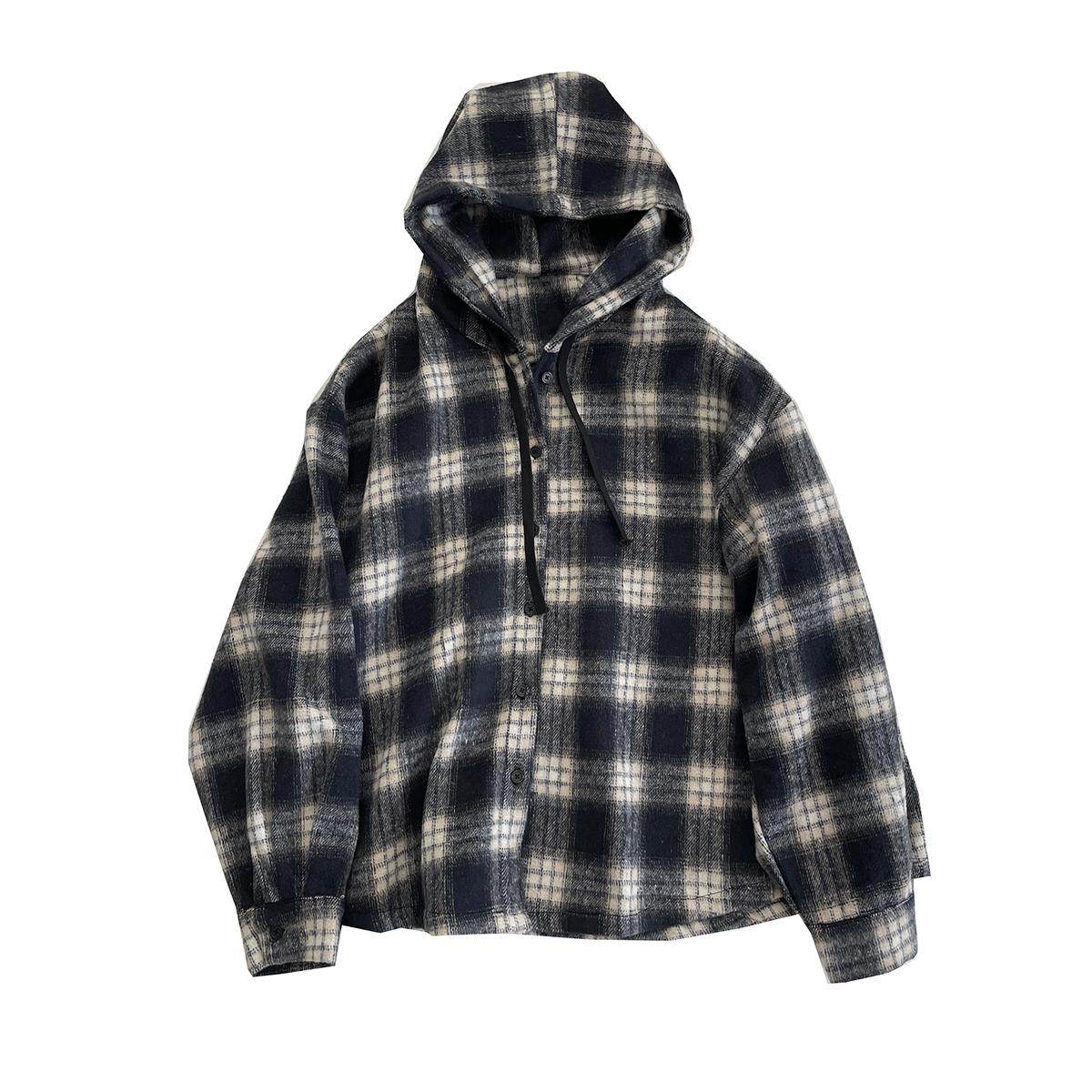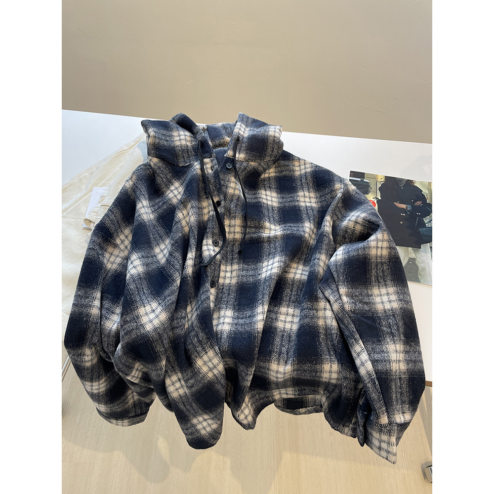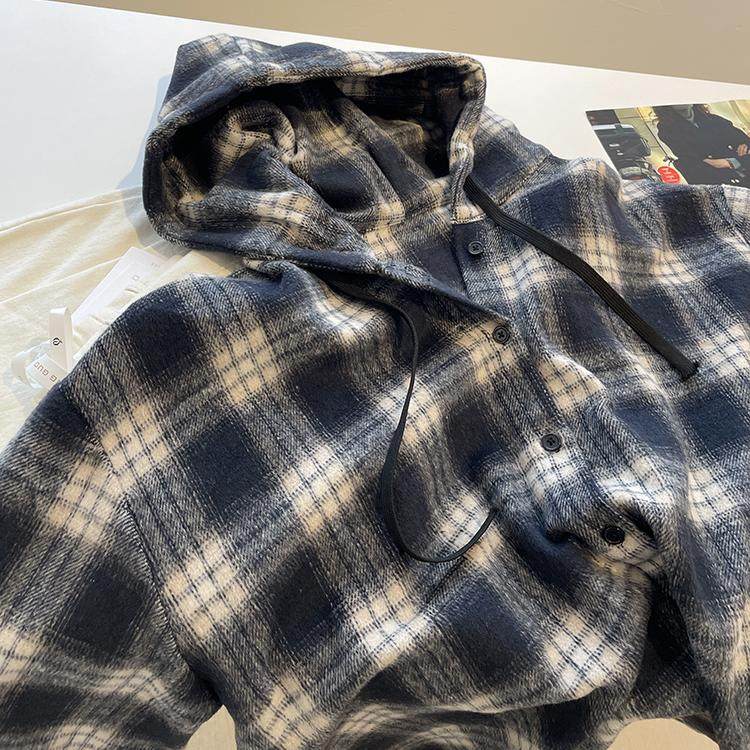 加厚磨毛~连帽格子衬衫女!2024秋冬慵懒宽松显瘦休闲衬衣薄外套