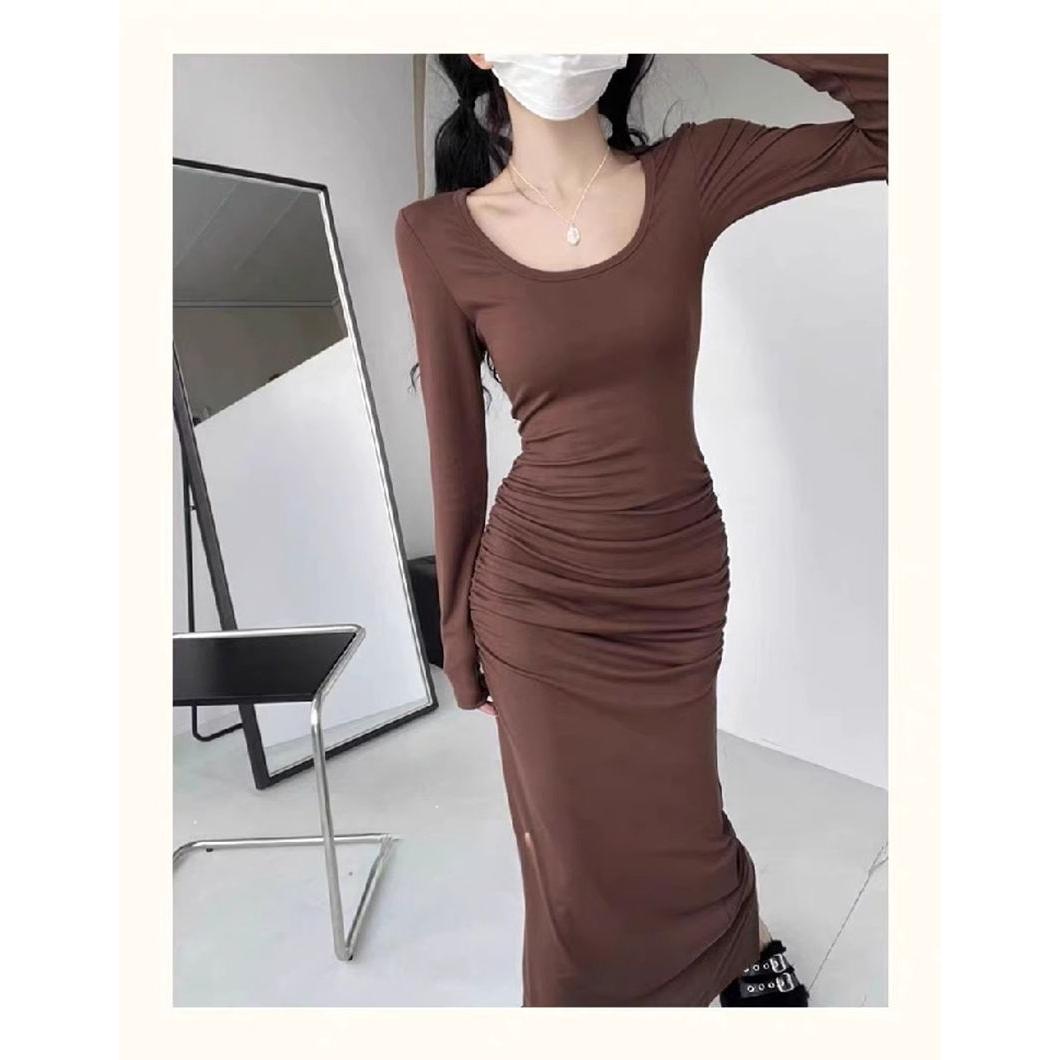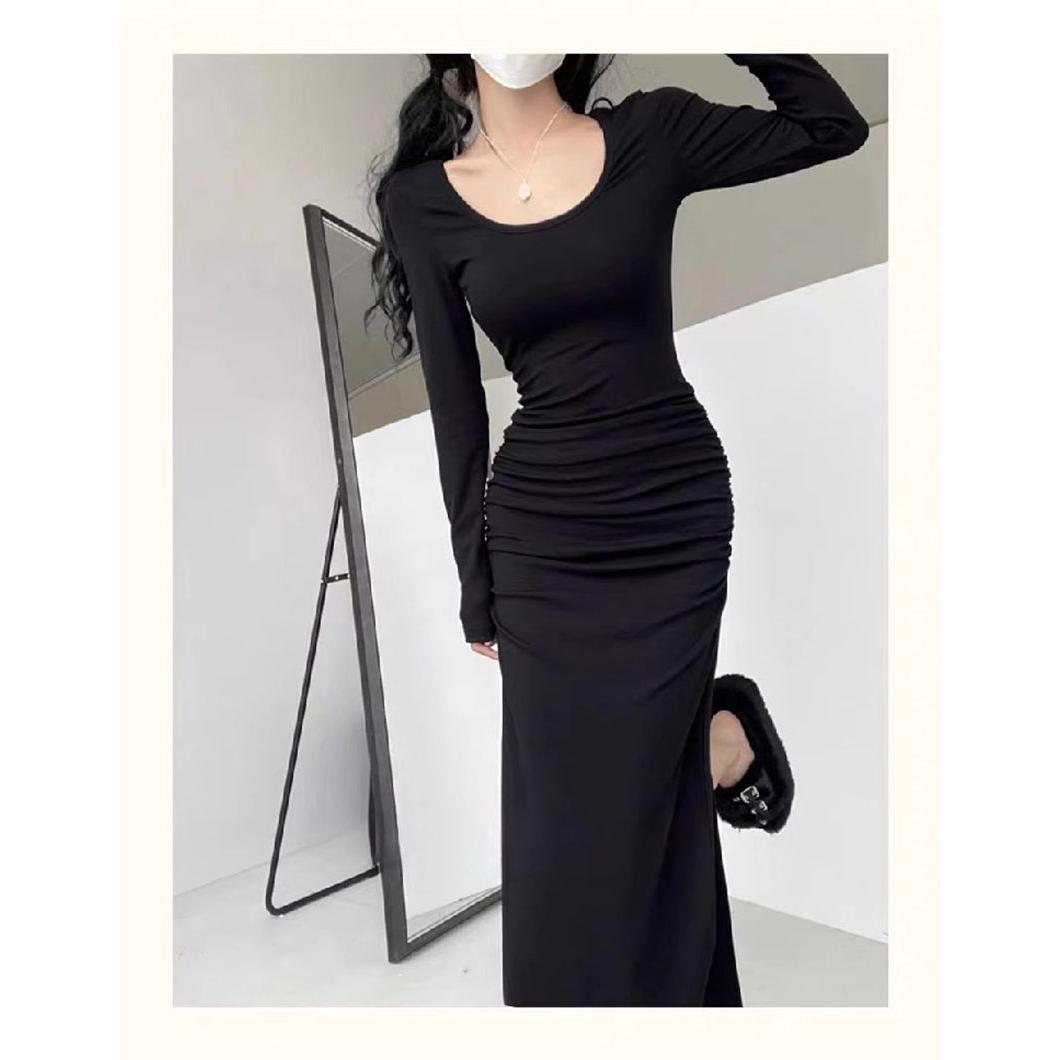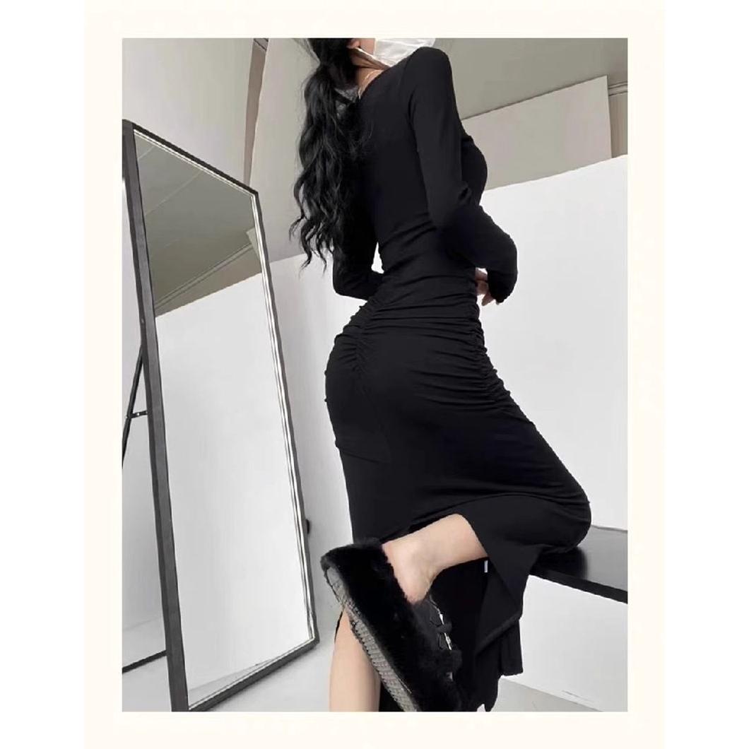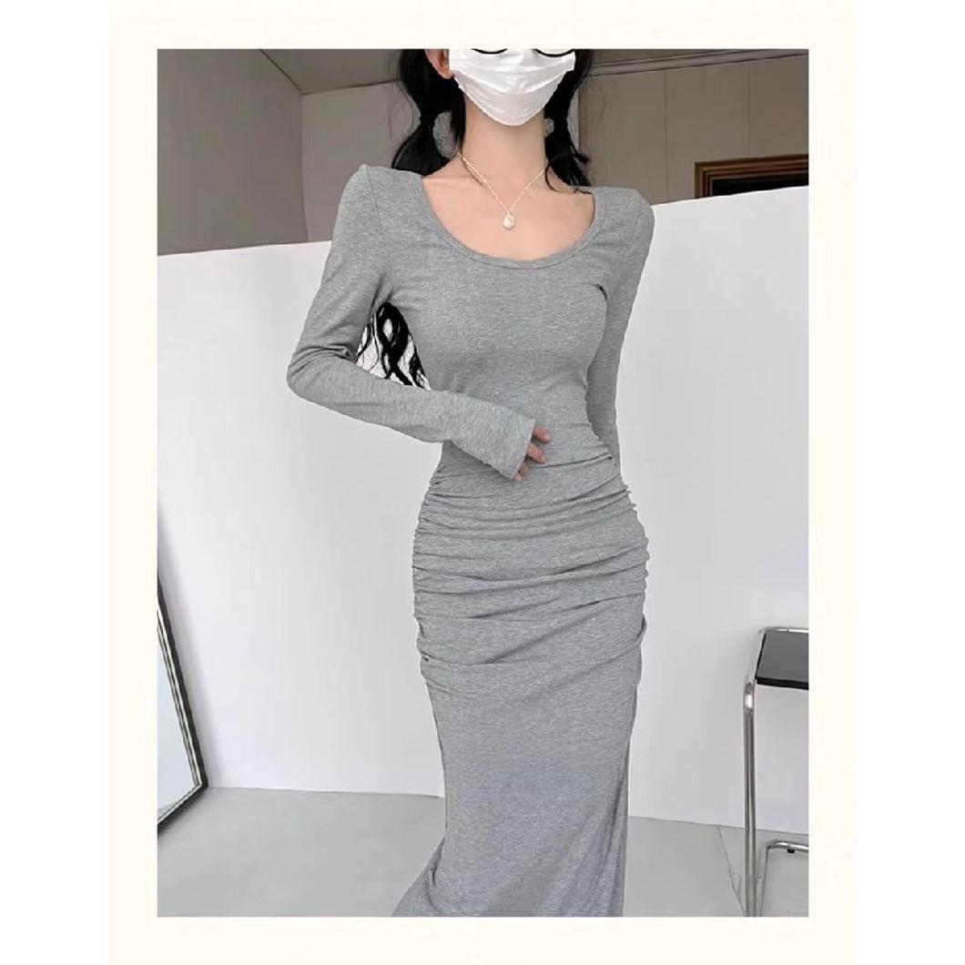 新款纯欲法式性感修身显瘦褶皱方领打底紧身长袖长裙鱼尾连衣裙