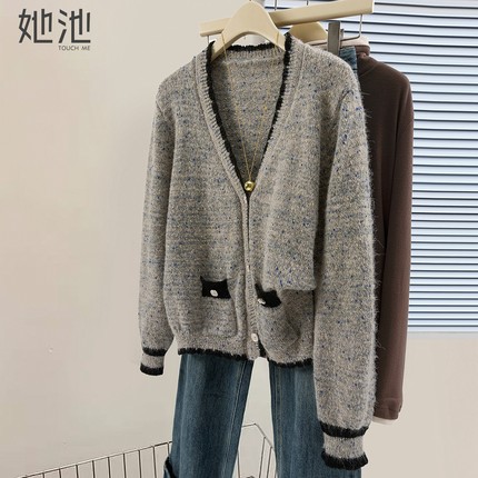 她池宽松款针织衫2025秋季新款女装撞色V领单排扣短款开衫外套