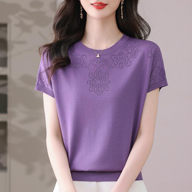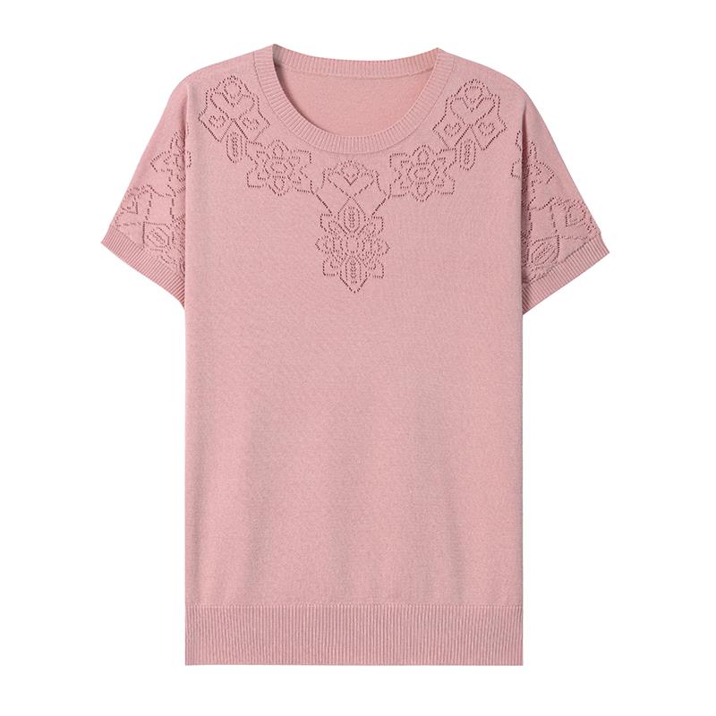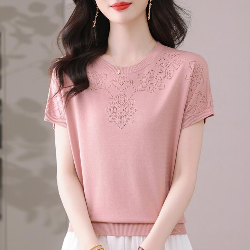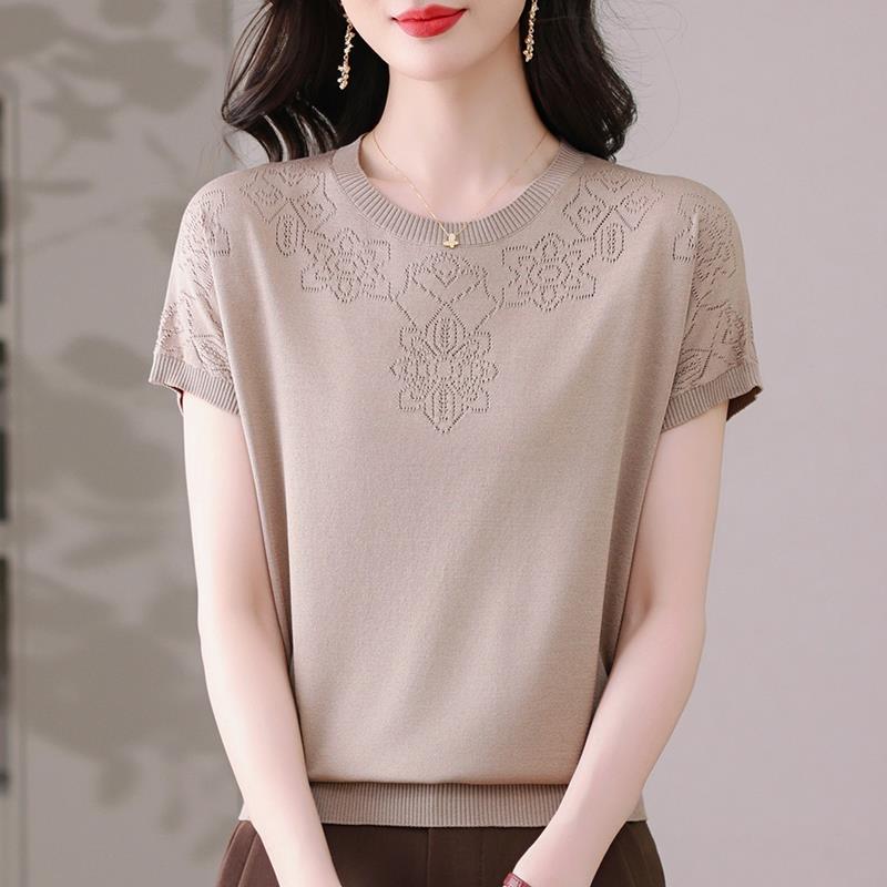 妈妈装桑蚕丝短袖t恤女夏季新款宽松洋气镂空冰丝针织衫打底上衣