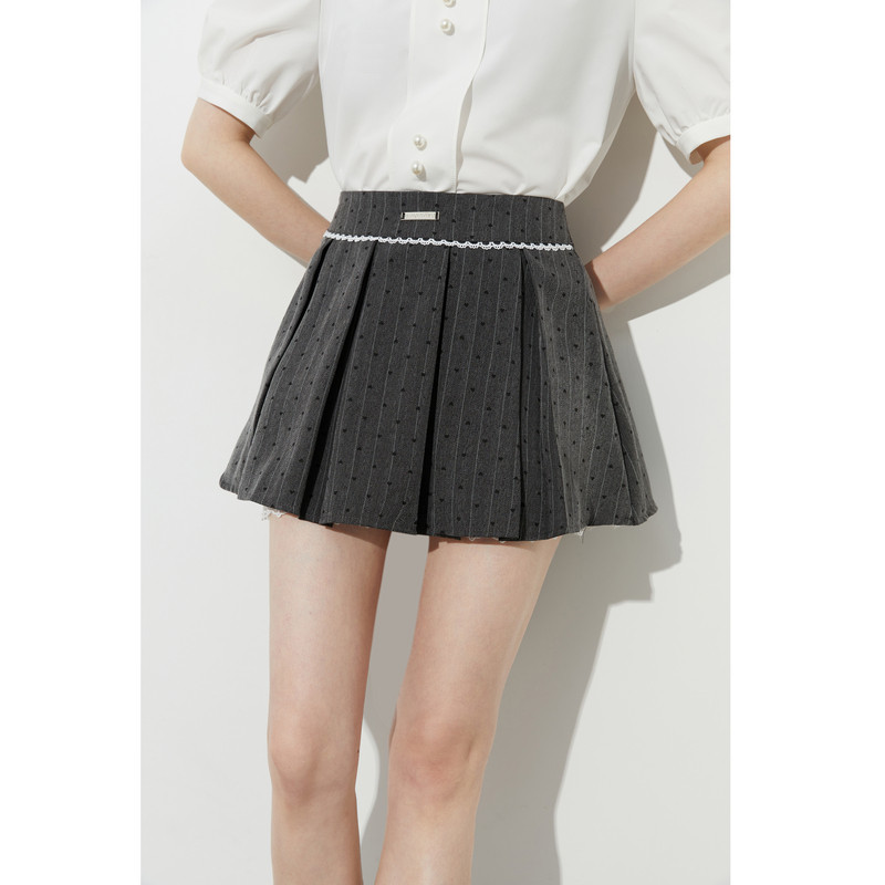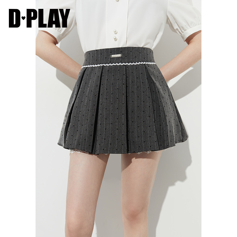 DPLAY【惠品】年夏季新款灰色半身裙女波点蕾丝百褶裙短裙