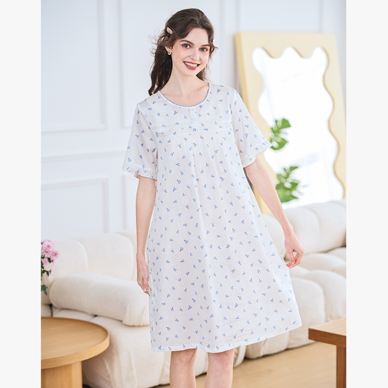 美标纯棉印花贡缎夏甜美短袖睡裙