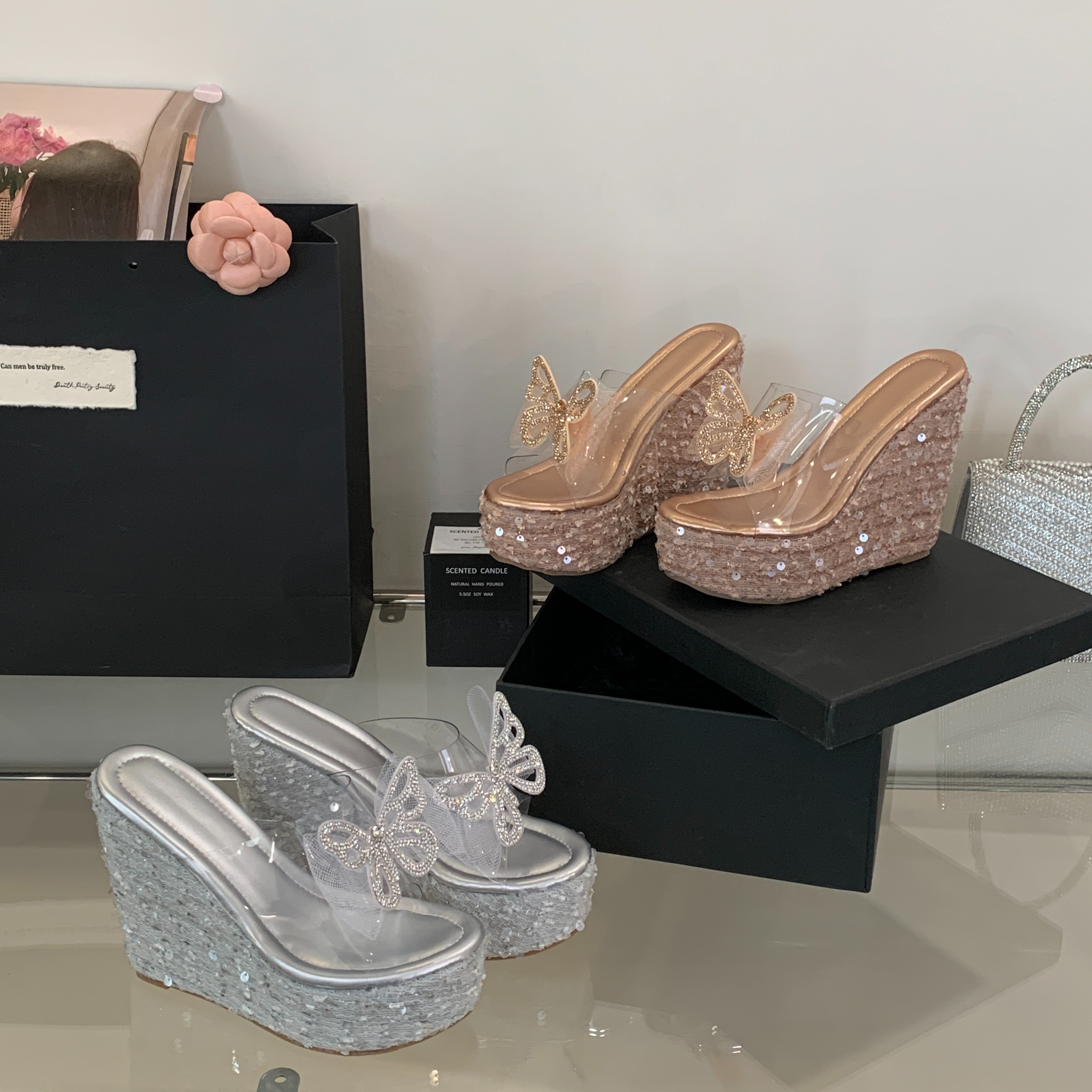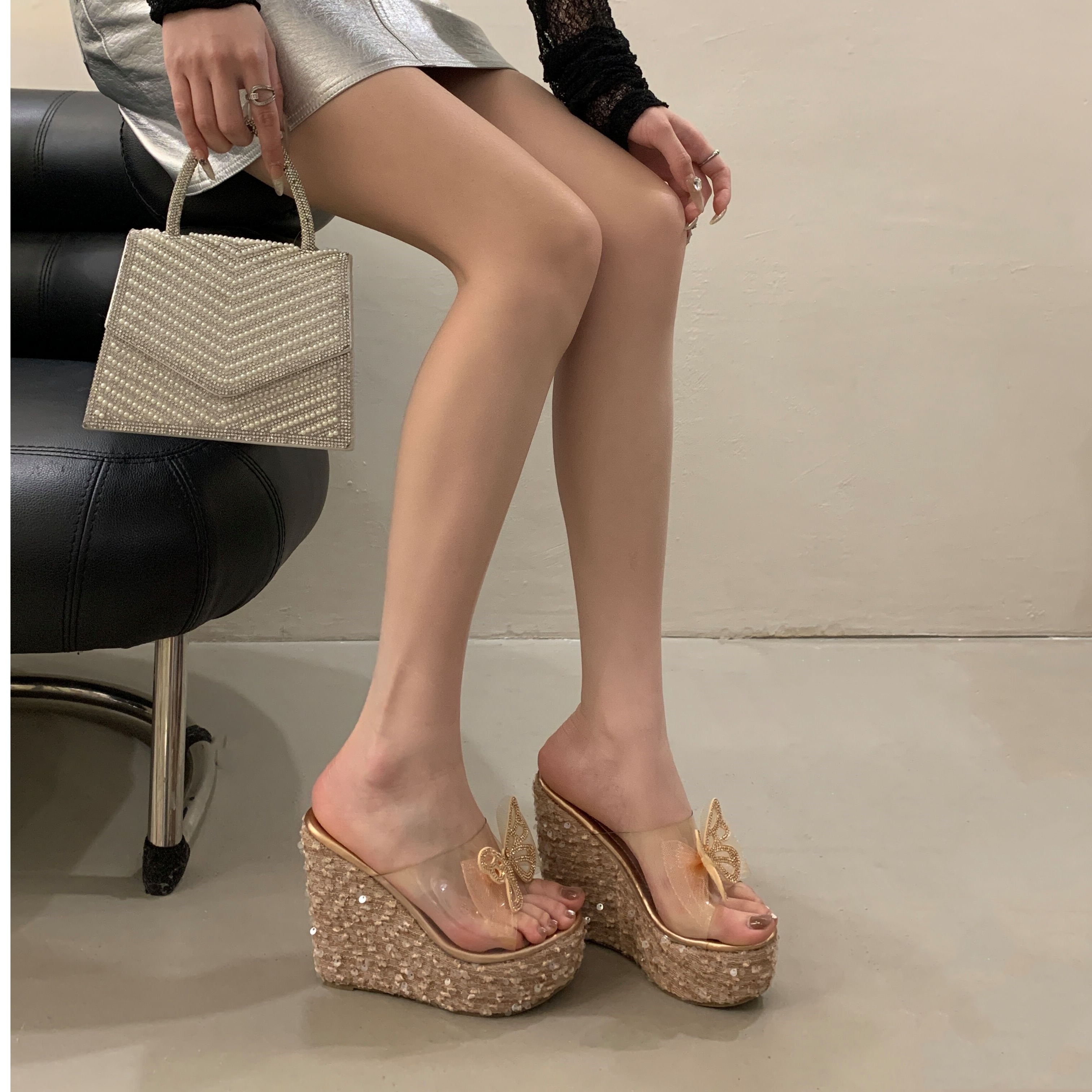 仙女度假风高跟鞋2025年夏季新款亮片蝴蝶结花朵坡跟厚底女凉拖鞋