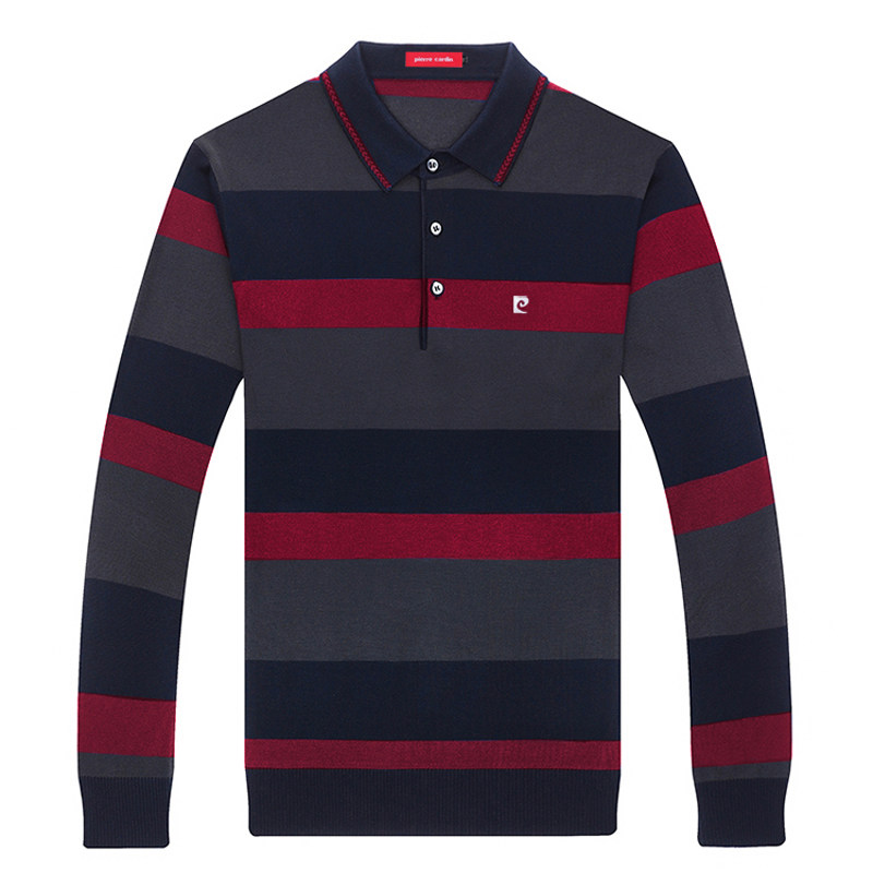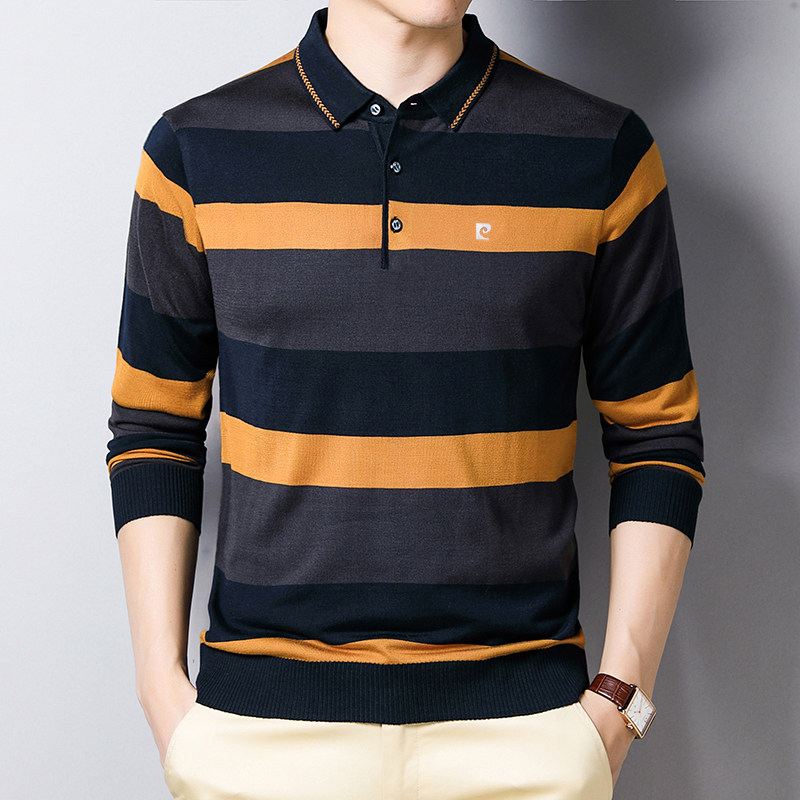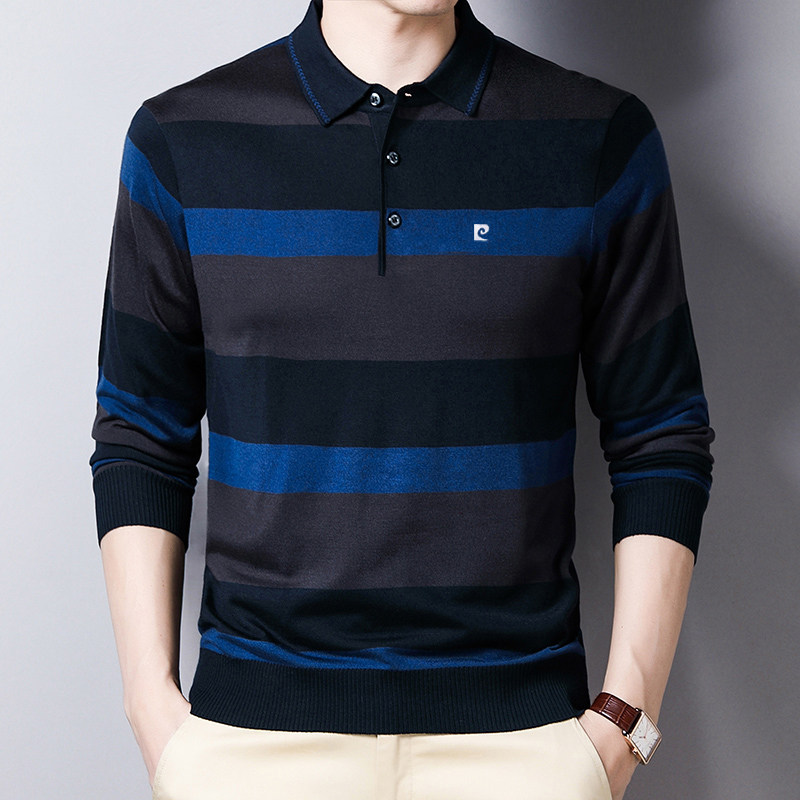 皮尔卡丹正品春秋男士桑蚕丝长袖t恤中老年翻领上衣爸爸条纹体恤
