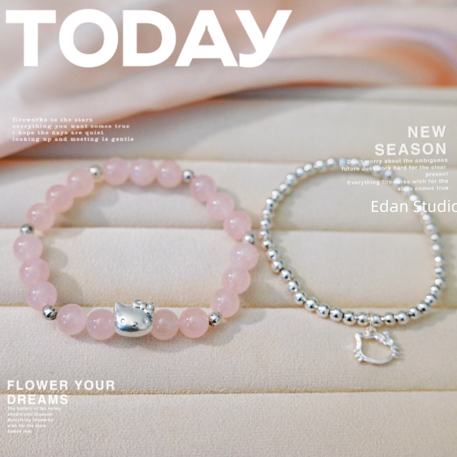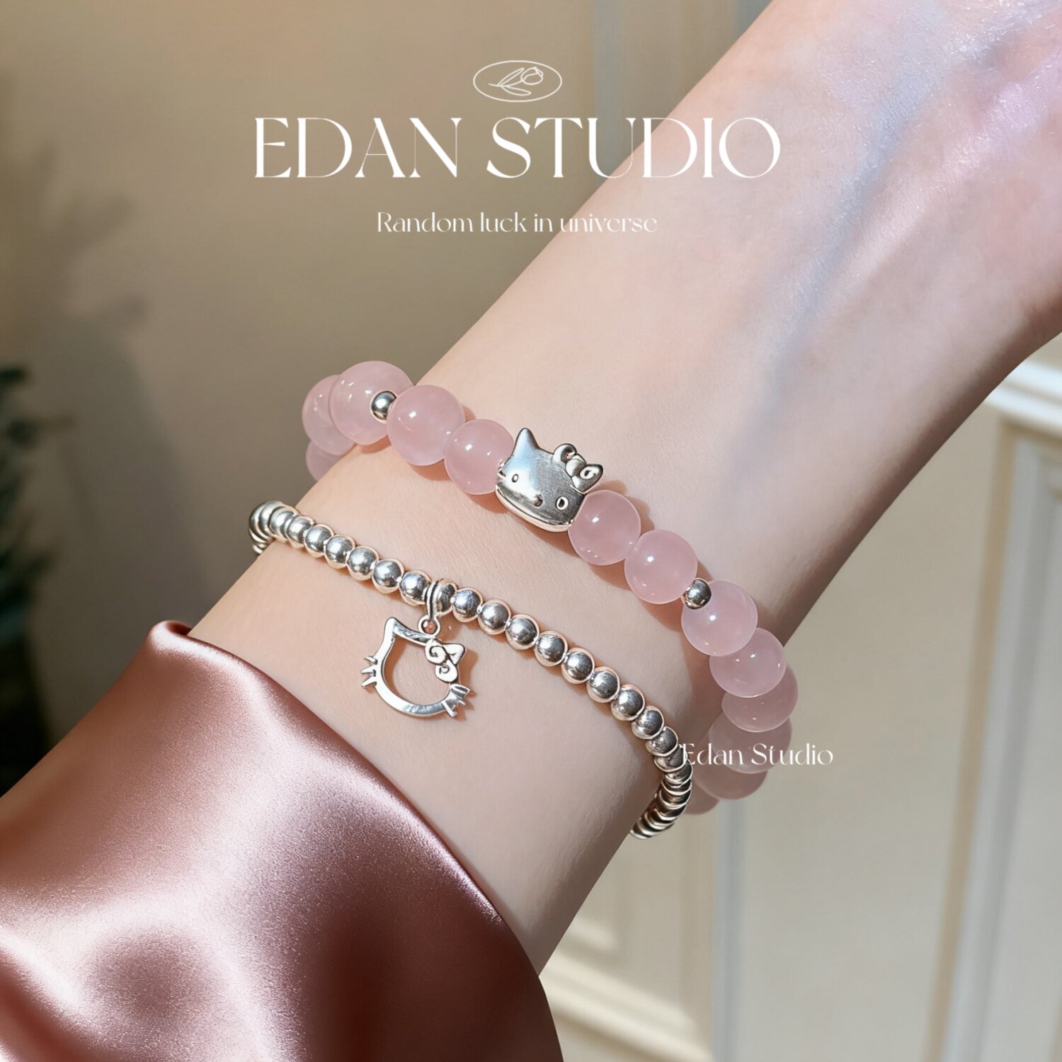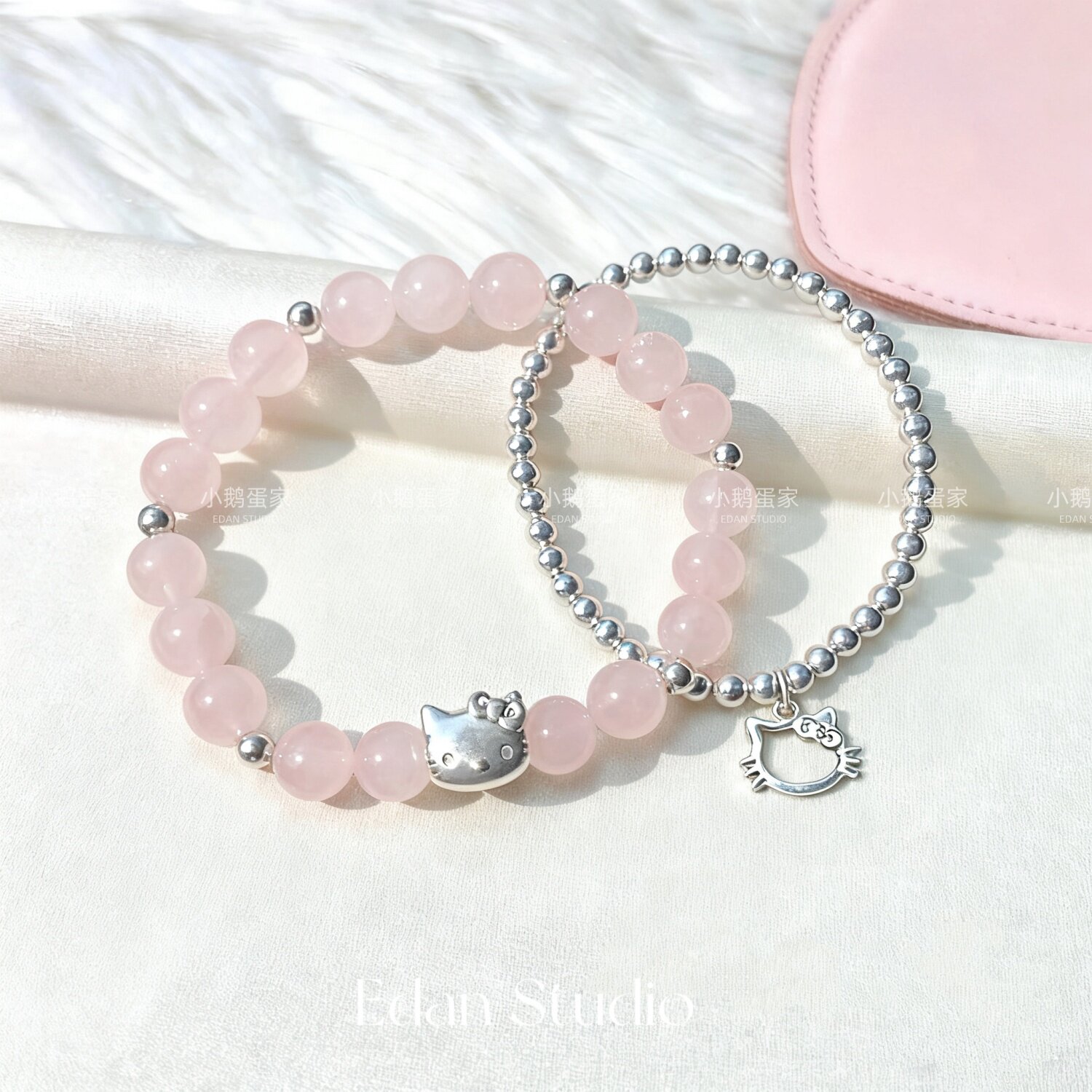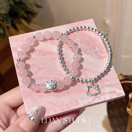 EDAN原创 【粉晶小猫】足银KT猫咪天然粉水晶转运银珠闺蜜手链女