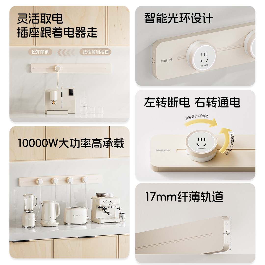 【15%】飞利浦超薄明装滑动轨道插座餐厨房岛台移动插座带氛围灯