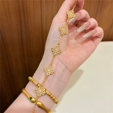 红玉髓镭射四叶草五花手链女18K玫瑰金轻奢叠戴礼物贝母黄金首饰