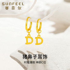 赛菲尔黄金耳饰足金999.9猪鼻子耳吊简约字母D耳环长款耳环送女友
