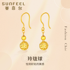 赛菲尔黄金耳饰足金玲珑球耳吊耳钩镭射珠镂空圆球长款耳坠送礼