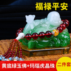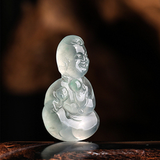 缅甸天然A货玉石翡翠孤品 精雕老坑双彩飘绿佛公大肚弥勒佛摆件