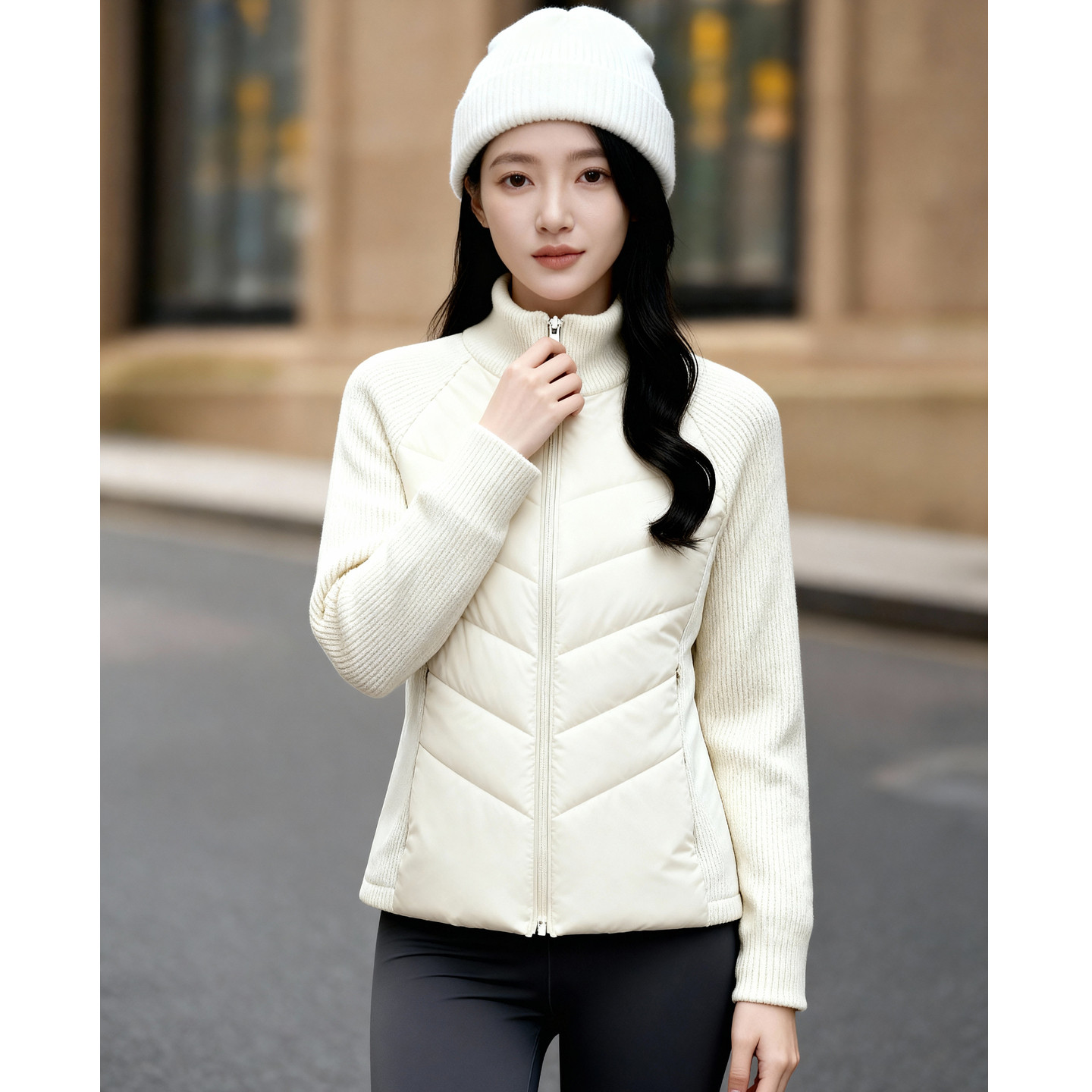 百家好立领针织拼接排骨棉服女冬季新款短款收腰修身保暖棉服外套