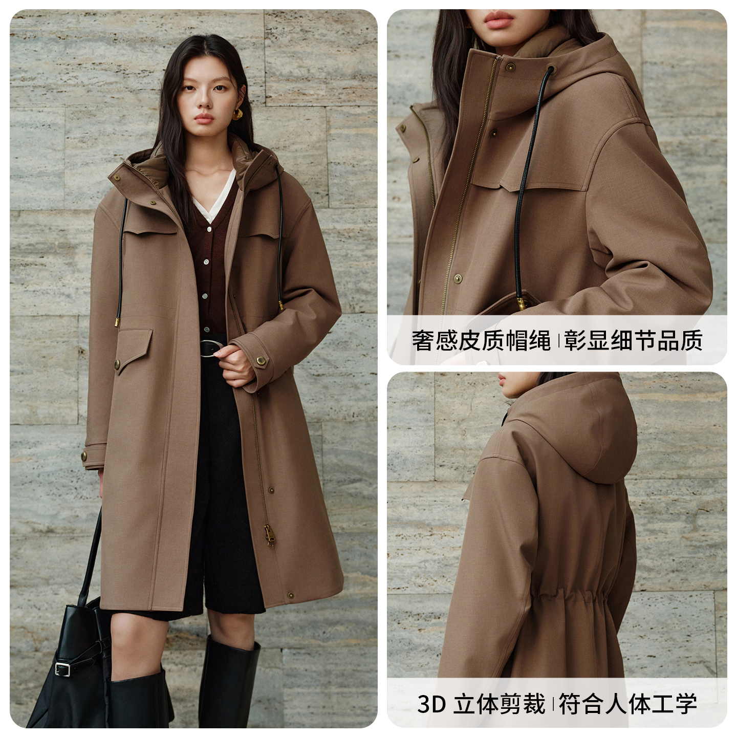 艾莱依时尚鹅绒服女2025秋冬新款摩登巴恩风连帽户外长款工装外套