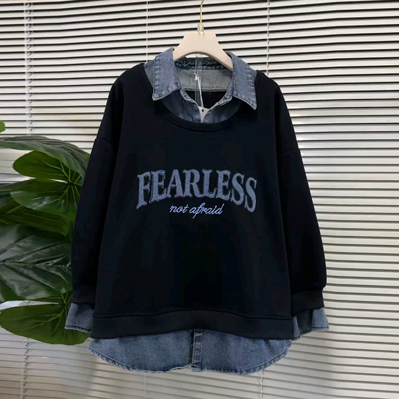2025早秋减龄新款大码女装胖MM时尚韩版圆领牛仔拼接字母遮肉卫衣