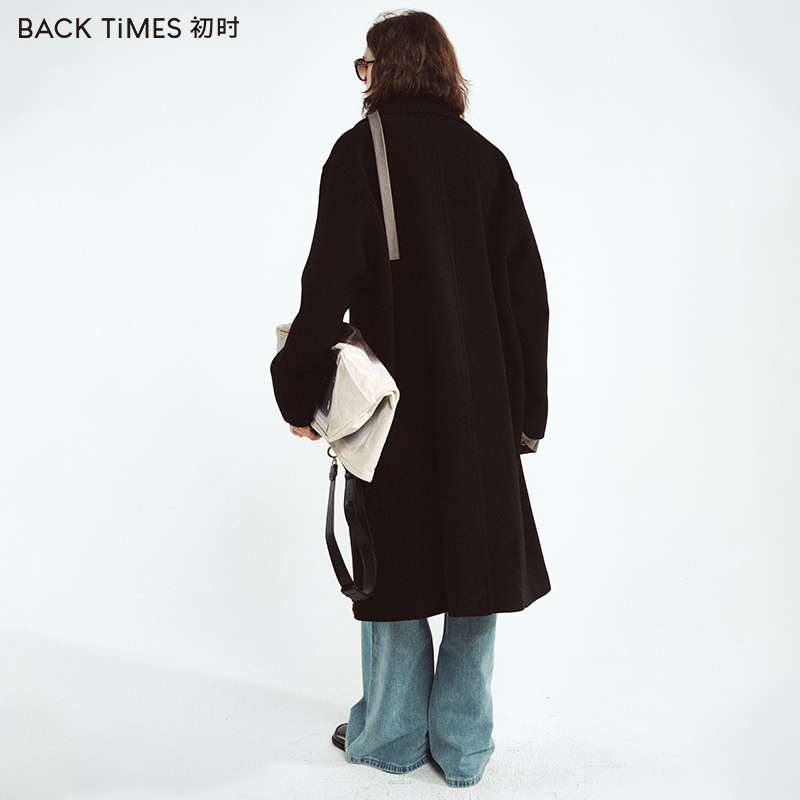 BACK TIMES新款羊毛大衣女中长款呢子黑色羊毛呢外套
