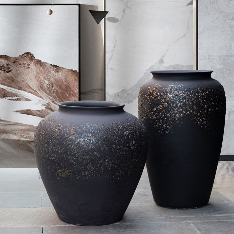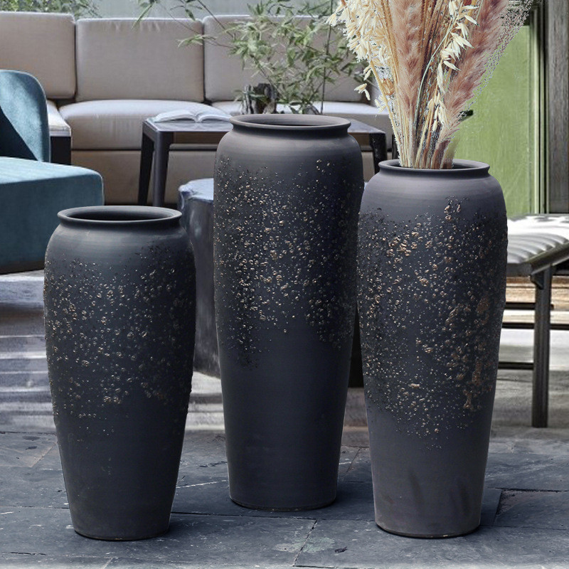 热销现代简约黑色酒店大堂落地陶瓷花瓶摆件干支陶罐插花器别墅样