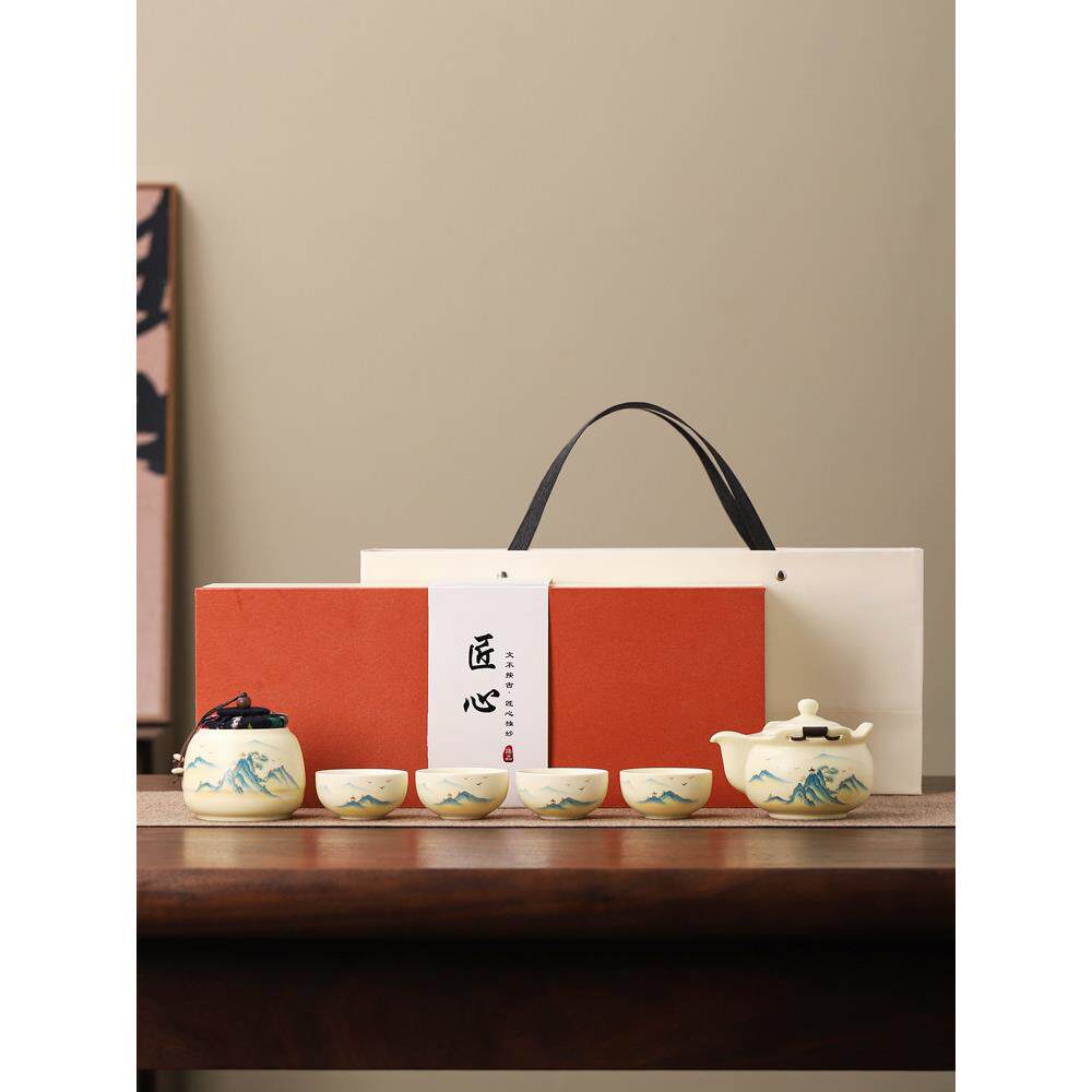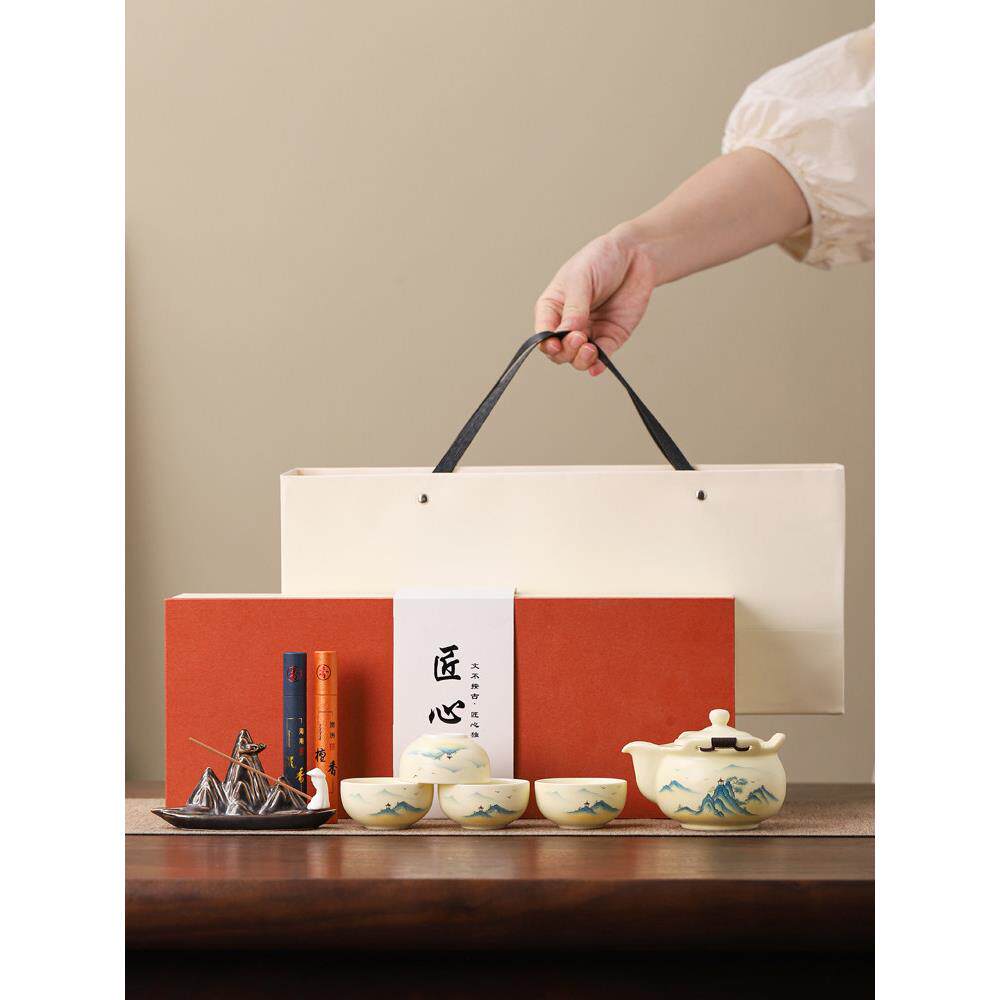 高档送礼茶具套装米黄定窑手抓壶四茶杯香炉中式礼盒装定制泡茶器