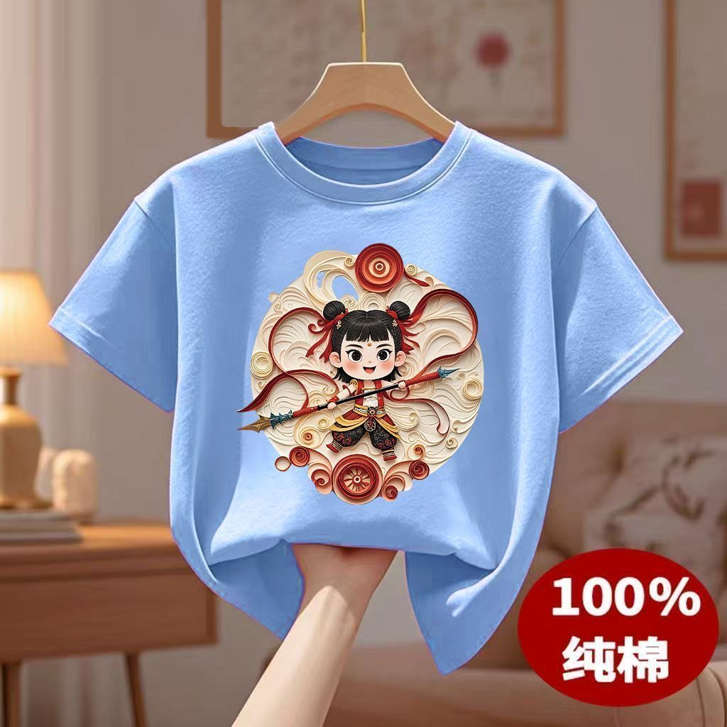 哪吒儿童纯棉短袖T恤2025夏季爆款男女童圆领上衣中大童国潮衣服t
