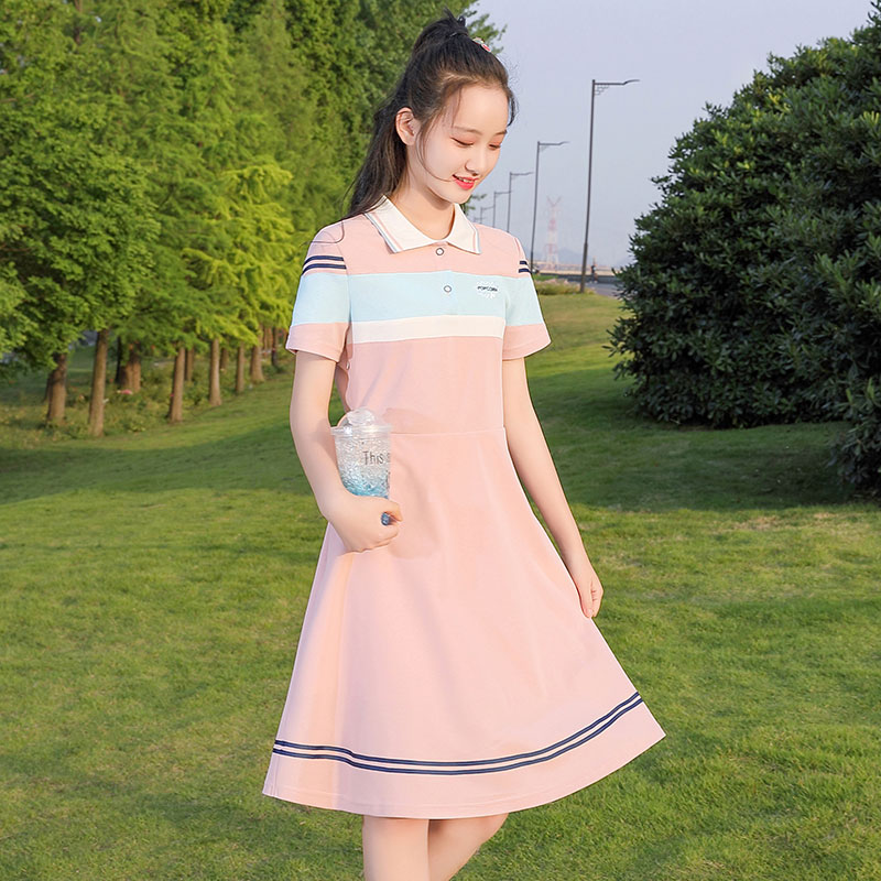 少女连衣裙夏装初中学生女孩高中生学院风长款polo领大童裙子韩版